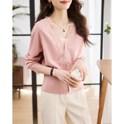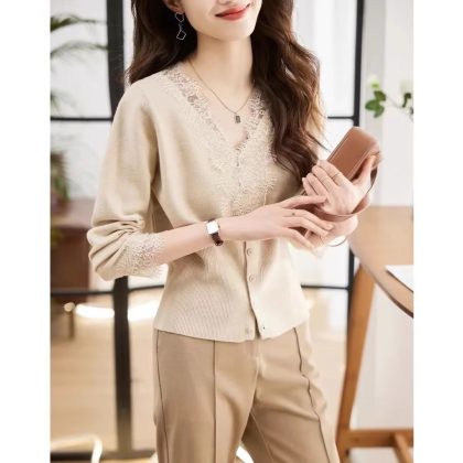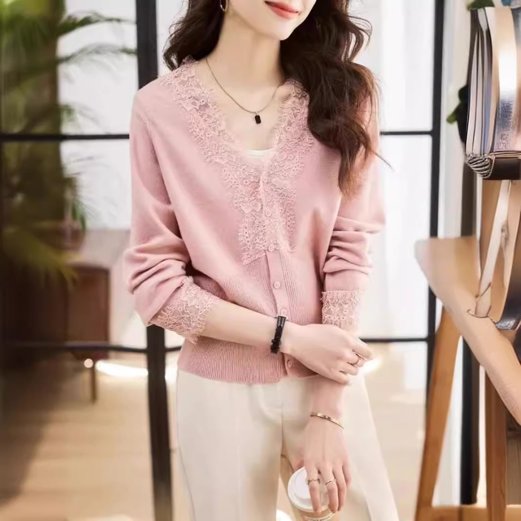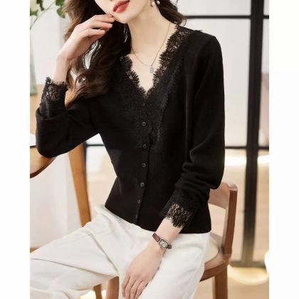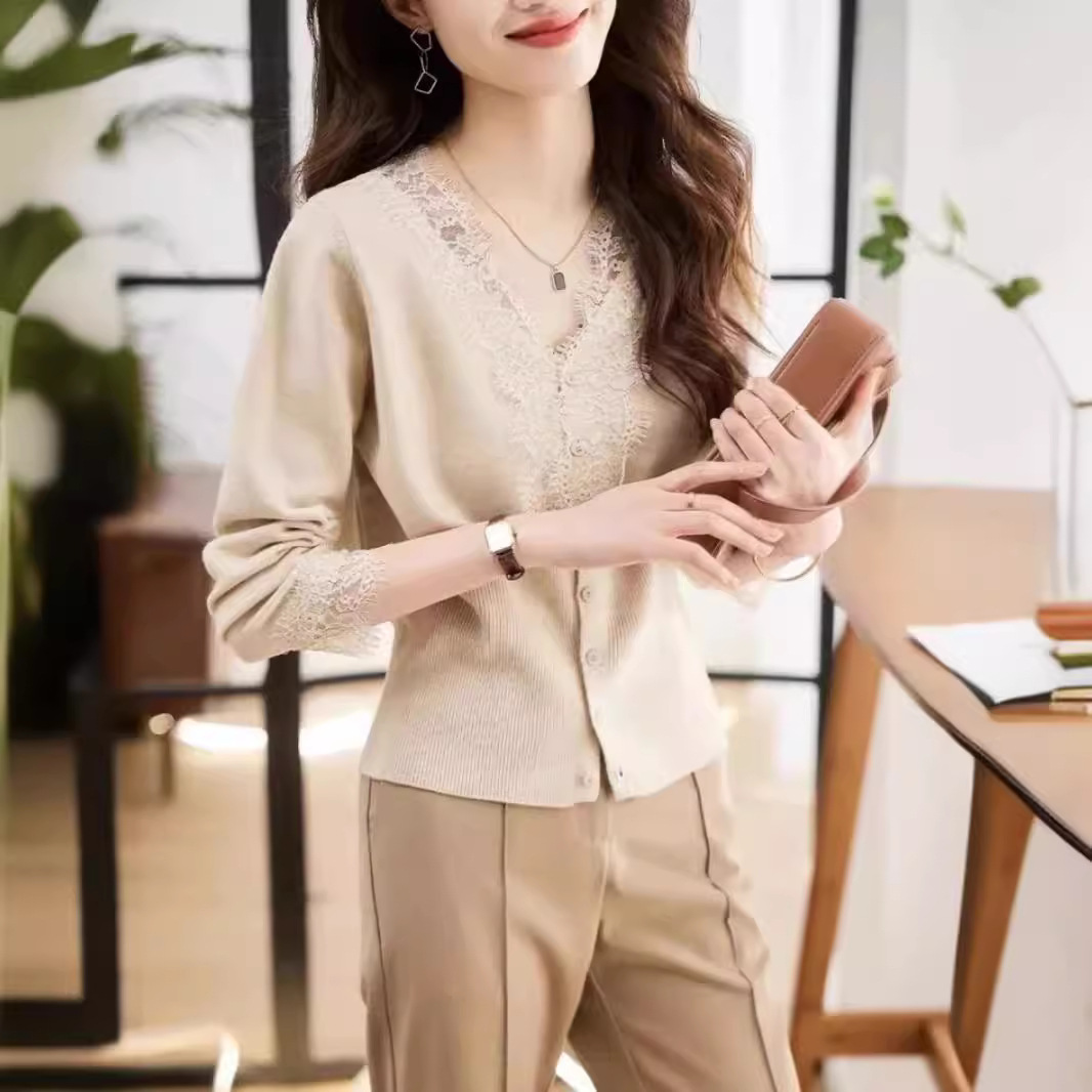 Lace Stitching Knitted Cardigan Women’s 2024 Autumn New Retro Elegant Elegant Slim V-Neck Base Top