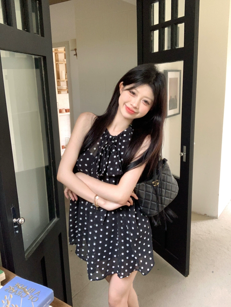| nameOriginal | Lace-up polka-dot sleeveless loose black chiffon shirt |