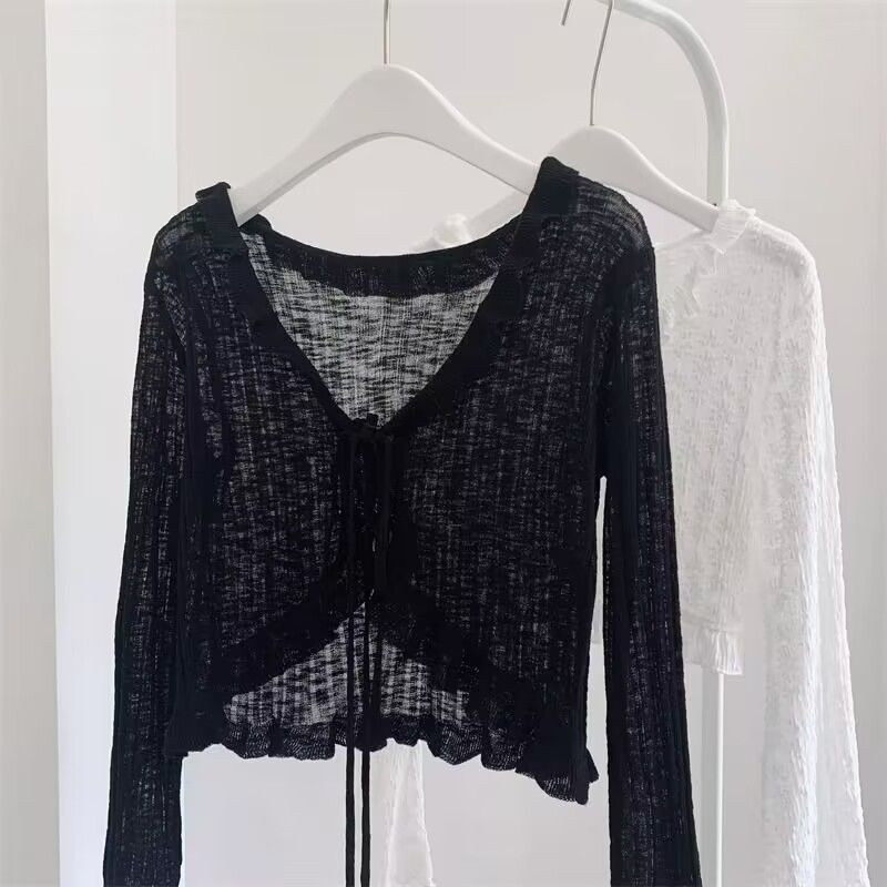 | nameOriginal | Lace-up Ruffled Ice Silk Knitted Sunscreen Cardigan Women's Summer Thin Small Shawl with Pure Sweet and Spicy Coat |