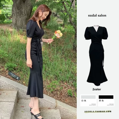 Lace-up slim fit fishtail ruffle women's summer little black dress