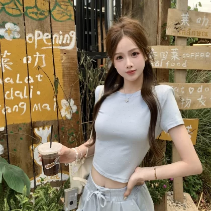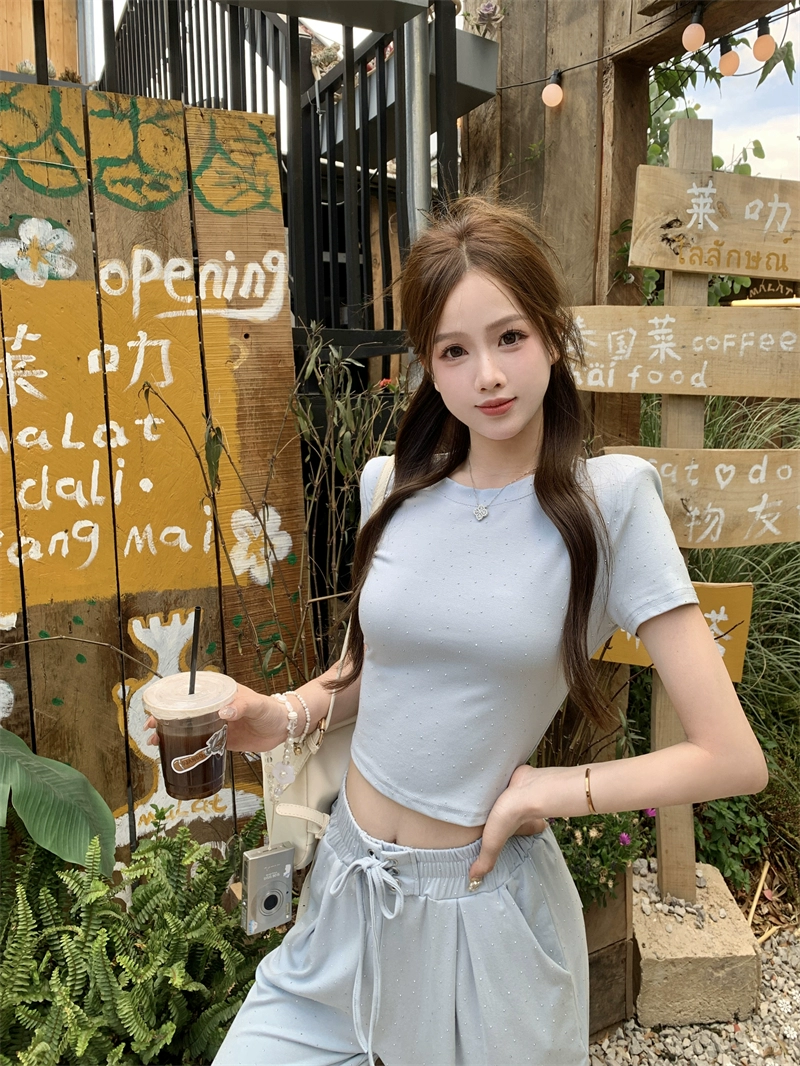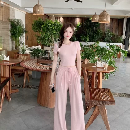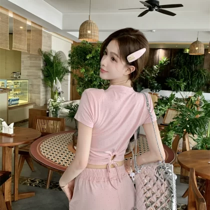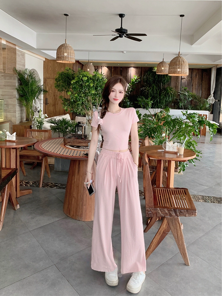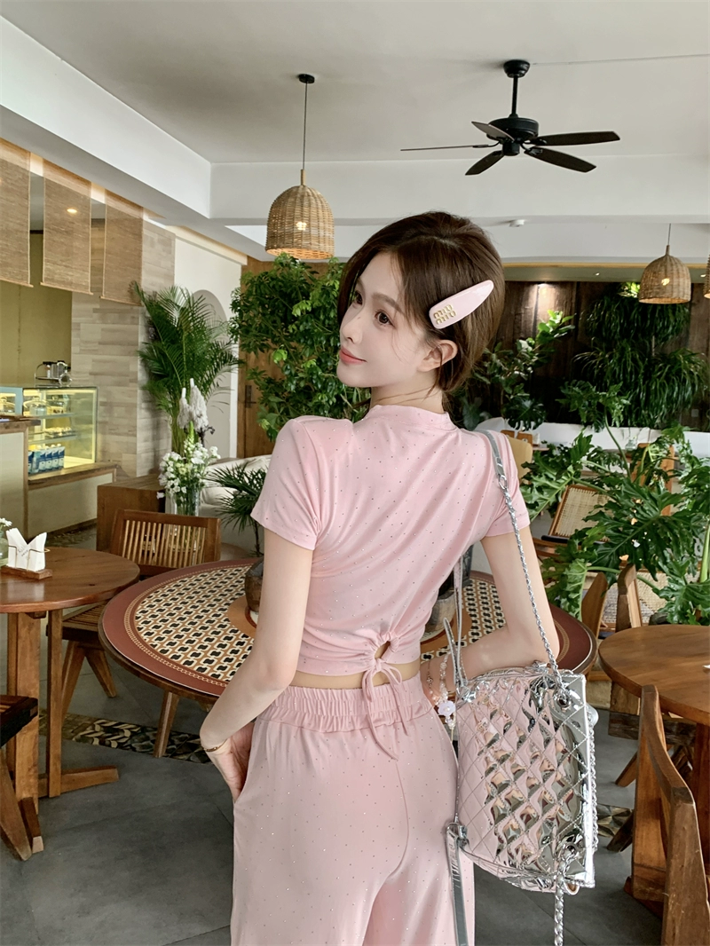 Lace-up tight short-sleeved T-shirt drawstring casual pants permed