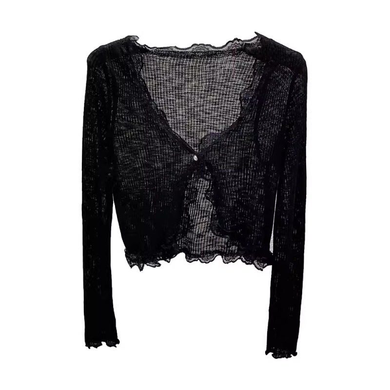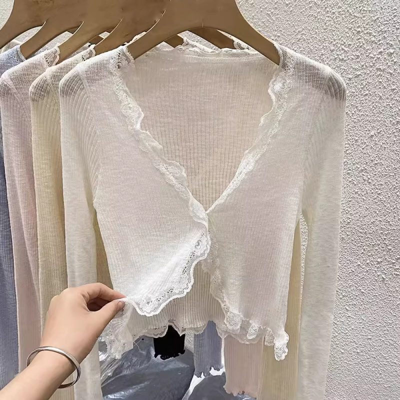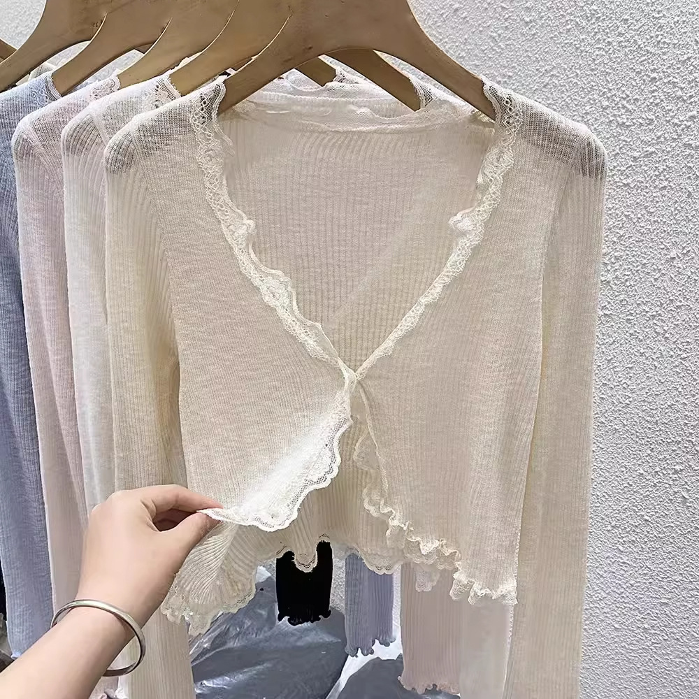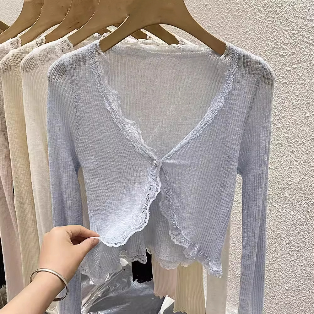 | nameOriginal | Lace V-neck Long-sleeved Knitted Cardigan Women's Summer Korean-style Gentle Slim-fit Short Knitted Sunscreen Top |