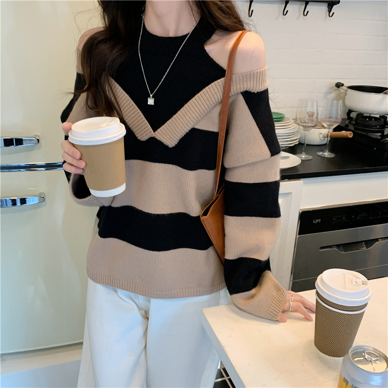 Ladies lazy wind sweater women’s 2022 autumn and winter New contrast color design leakage shoulder slimming pullover sweater wholesale