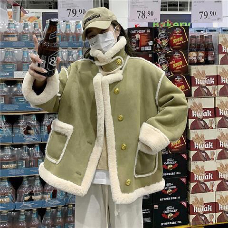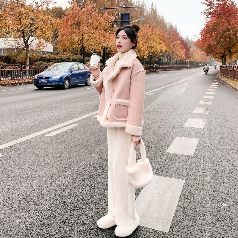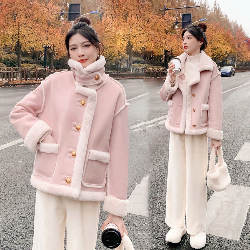Lamb wool coat pink one-piece women’s winter 2023 new small Korean style stitching thickened motorcycle clothing cross-border