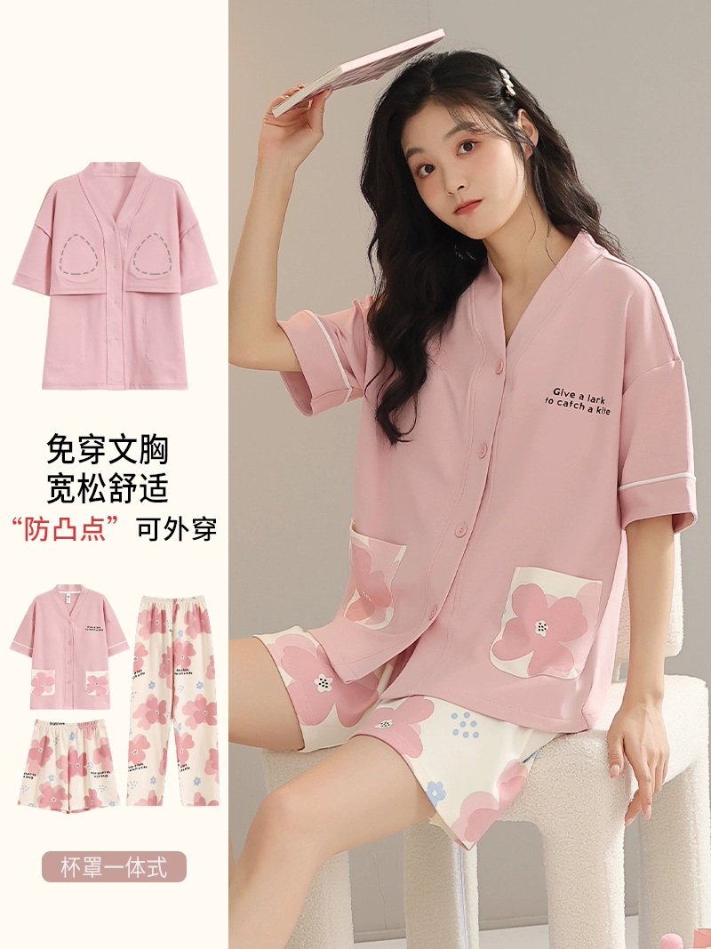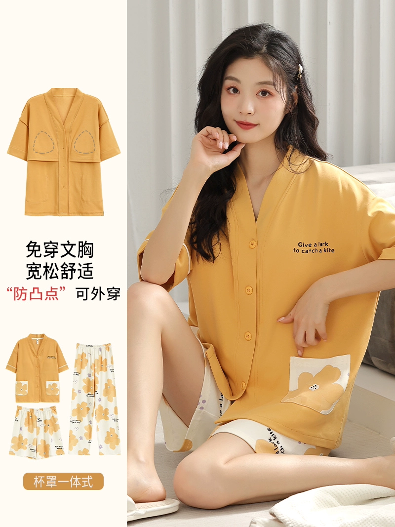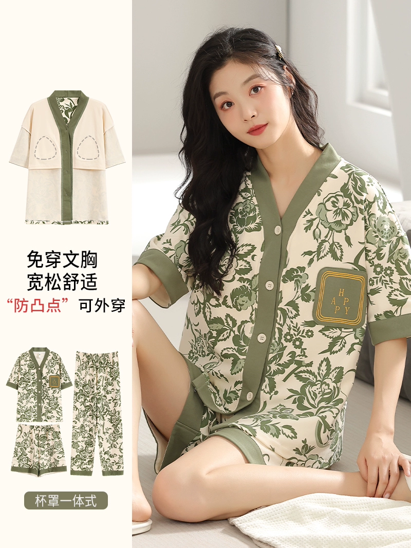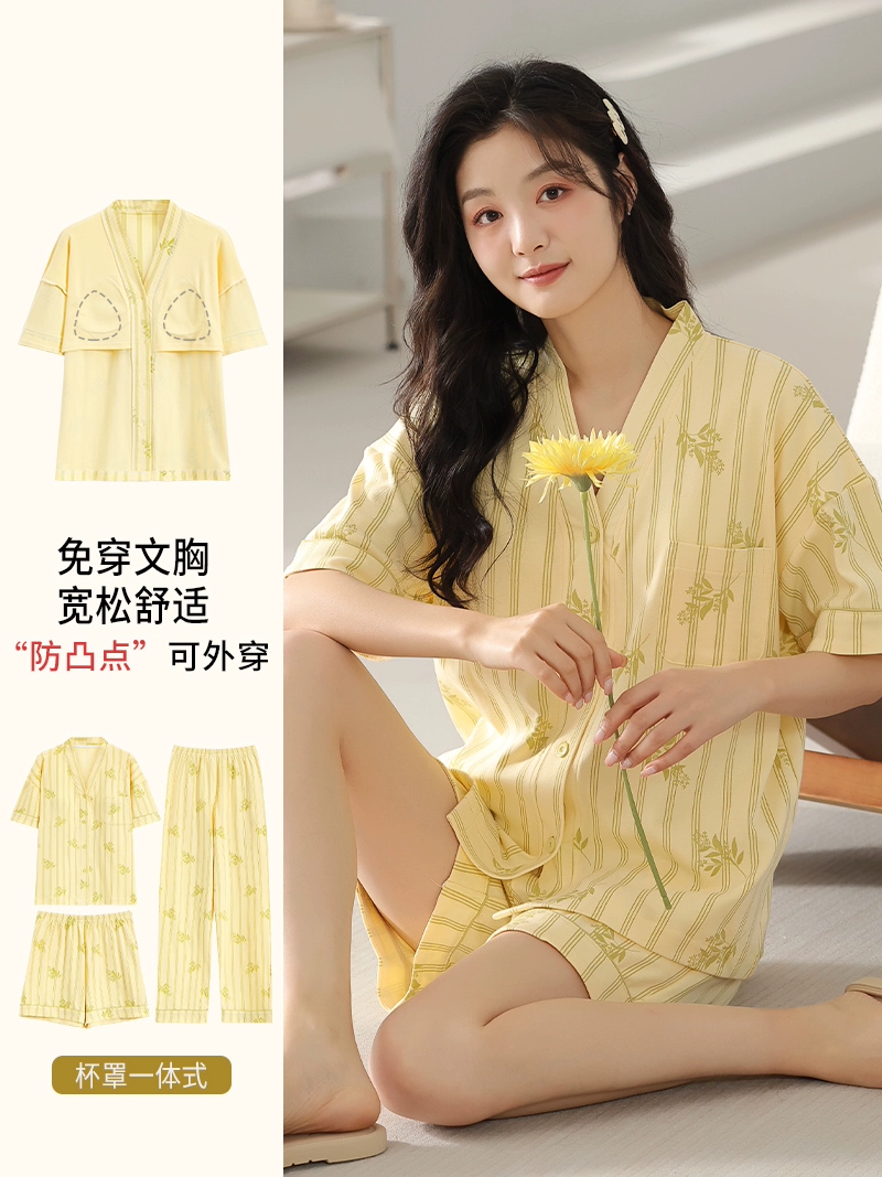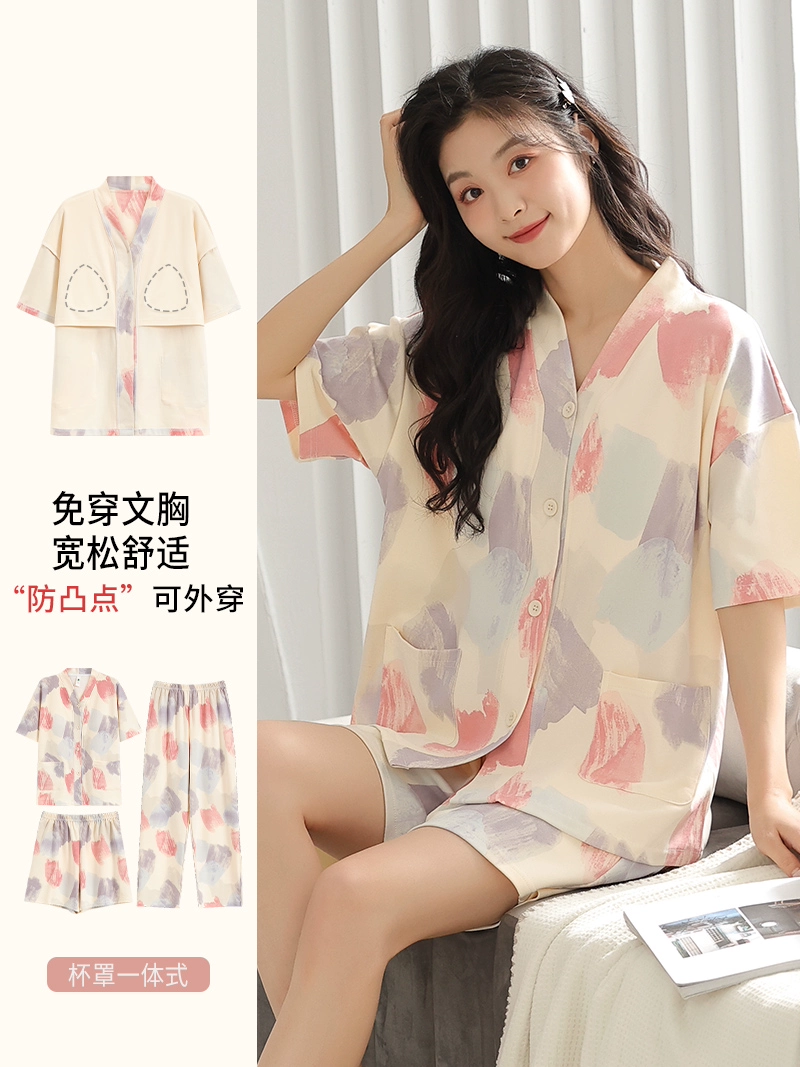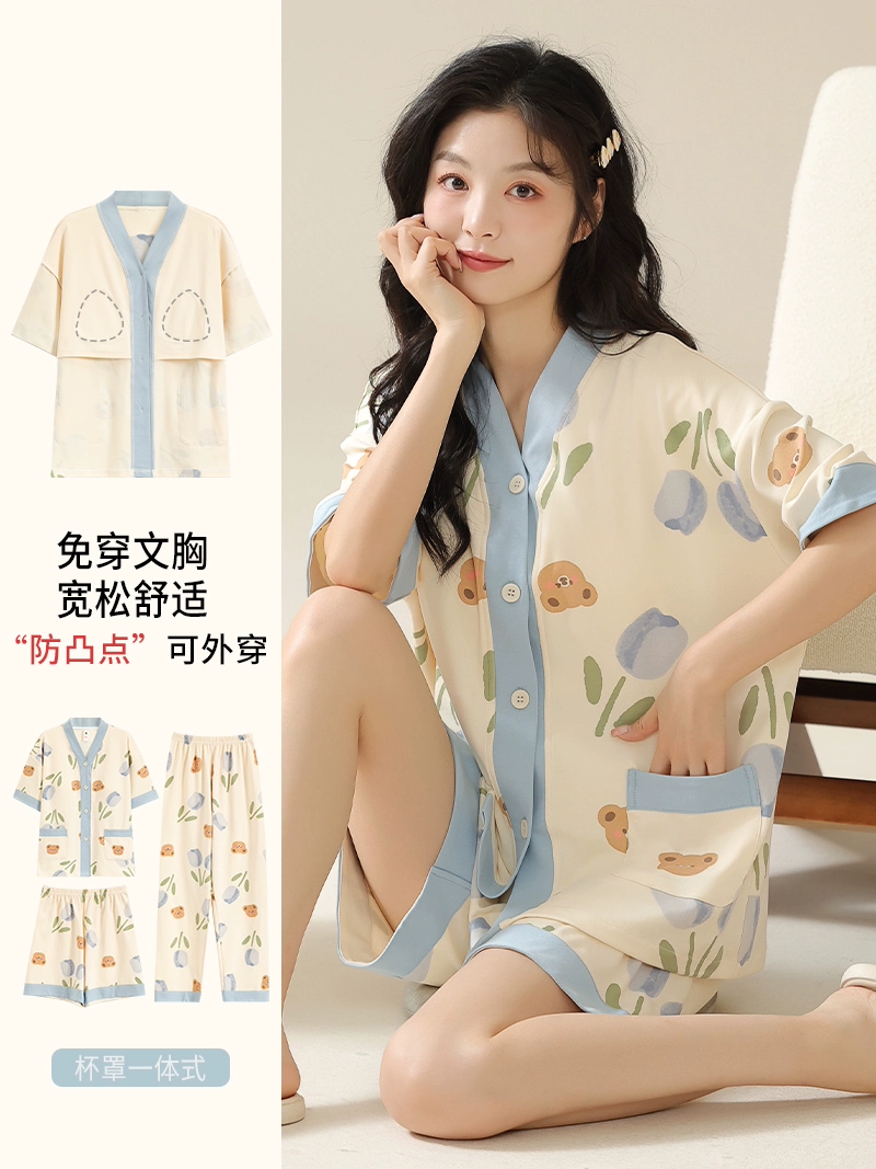 | nameOriginal | Langsha pajamas women's summer pure cotton short-sleeved shorts three-piece suit with chest pad large size casual can be worn outside home clothes |