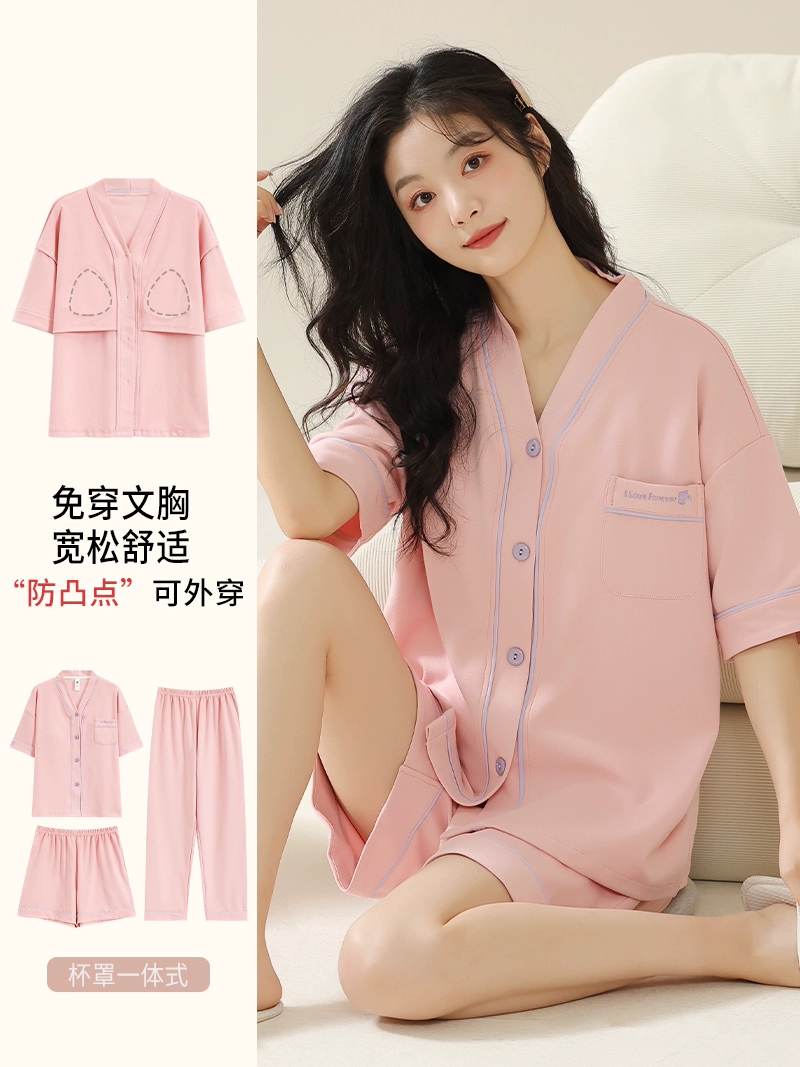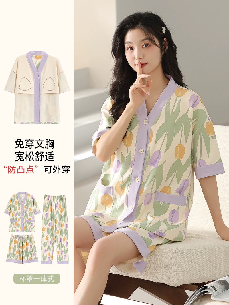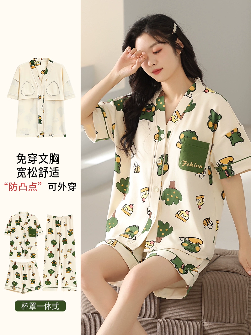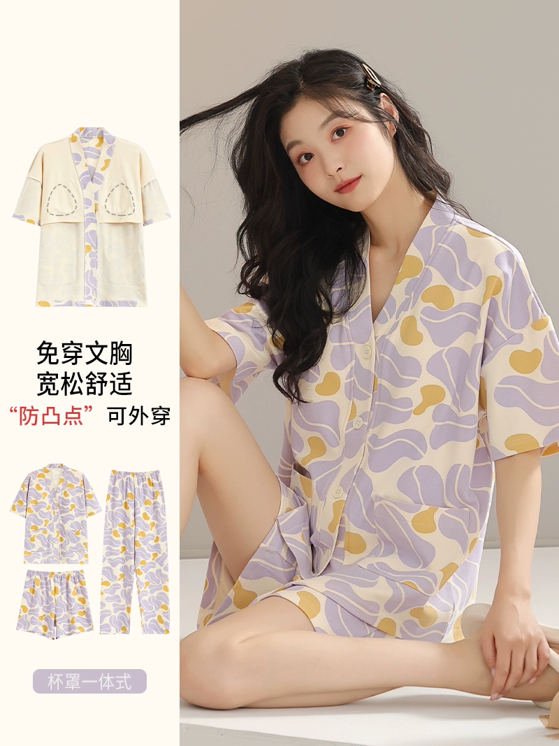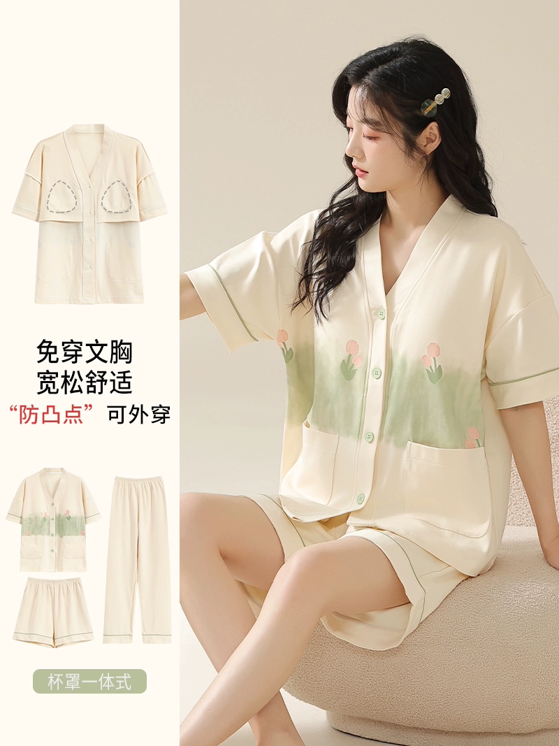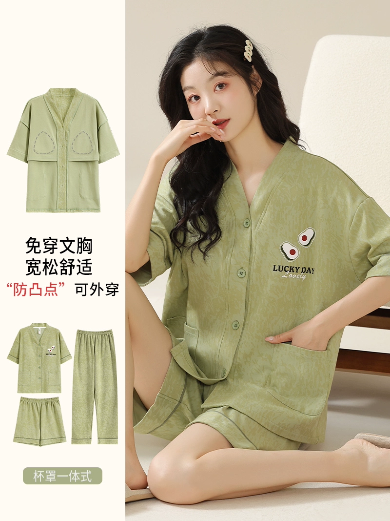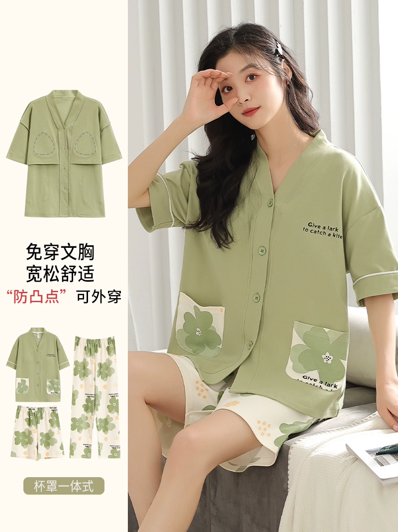 | nameOriginal | Langsha pajamas women's summer pure cotton short-sleeved shorts three-piece suit with chest pad large size casual can be worn outside home clothes |