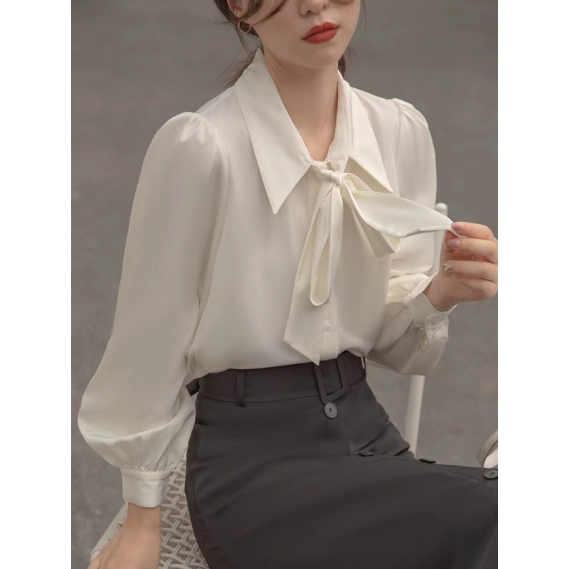 Lantern sleeve elegant autumn and winter bow shirt white shirt women’s long sleeve lace-up design professional top