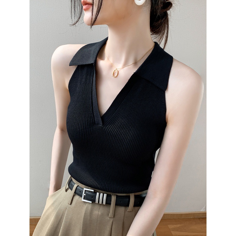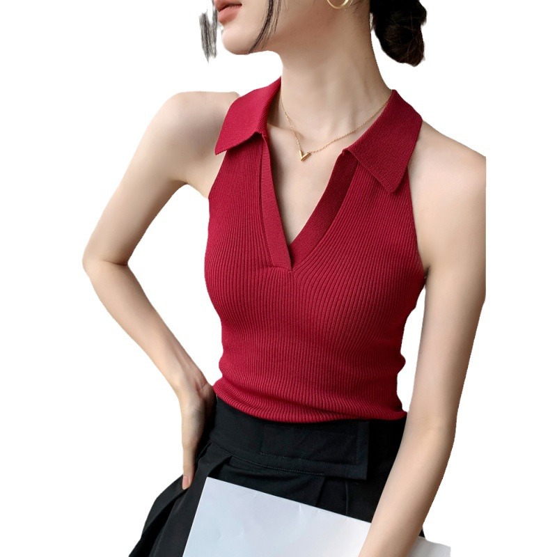 Lap Collar Sleeveless Top Women’s 2024 Summer New Slim Fit T-Shirt Sweet Spicy Hanging Neck V-Neck Knitted Vest for Women