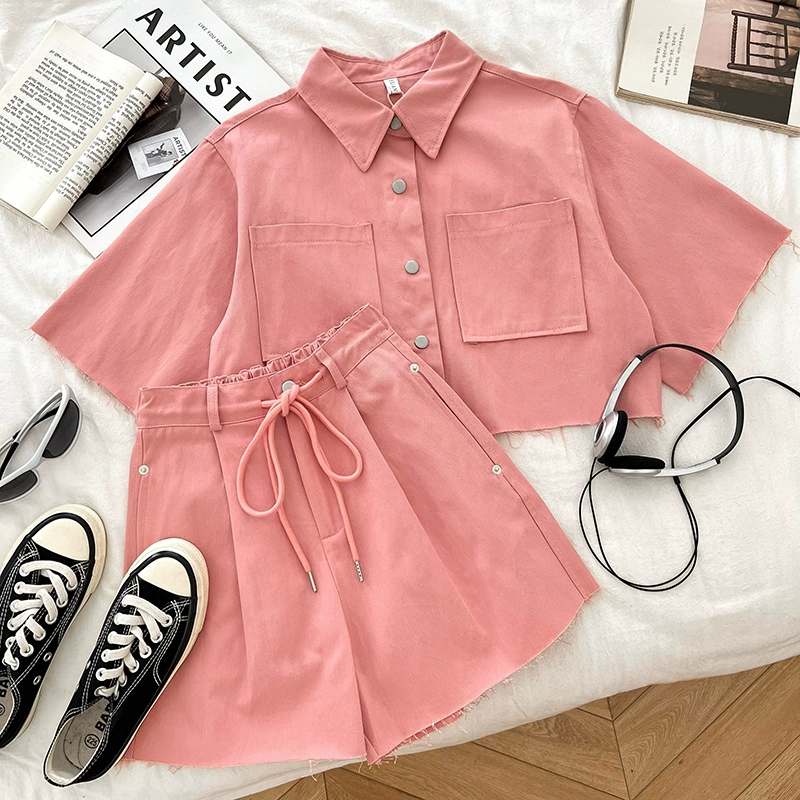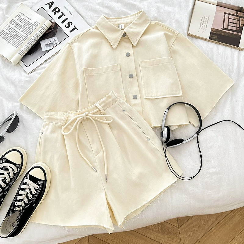 | nameOriginal | Lapel big pocket short furry shirt top + drawstring elastic waist shorts wide leg pants two-piece set for women |