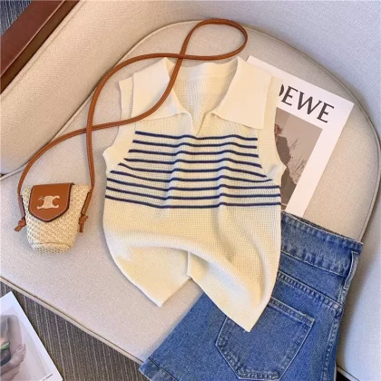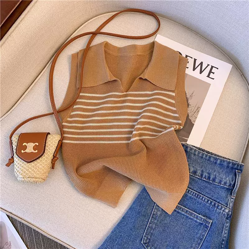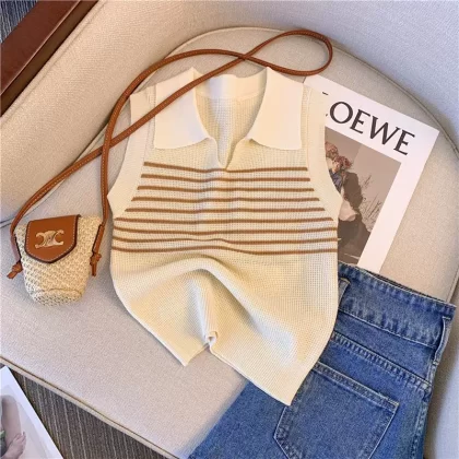 | nameOriginal | Lapel Contrast Color Striped Sleeveless Women's Summer Knitted Vest |