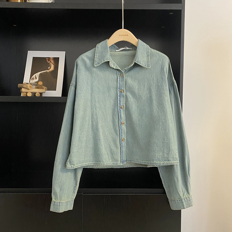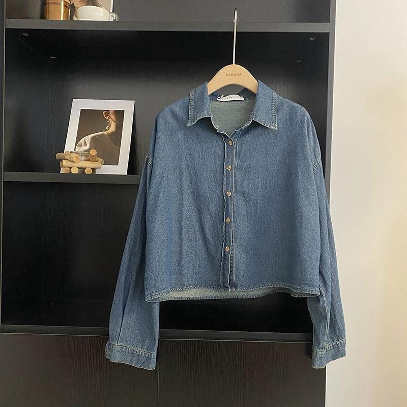 | nameOriginal | Lapel single-breasted denim blue long-sleeved shirt for women 2023 autumn and winter Korean style fashion versatile loose Hong Kong style top trend |