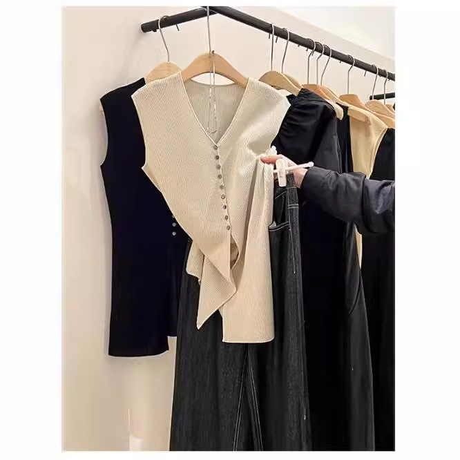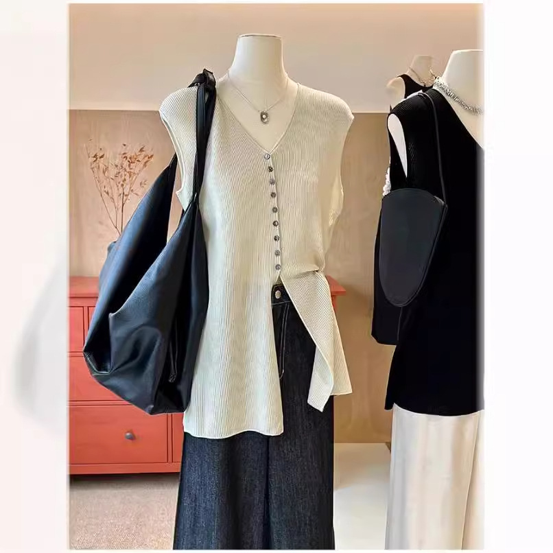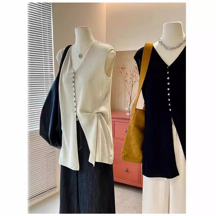 | nameOriginal | Laqian Style Knitted Vest Women's Summer V-neck Loose Split Design Sense Light Mature Waistle Sleeveless French Style Elegant Top |