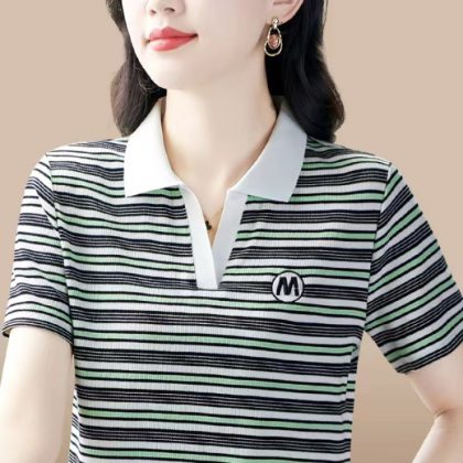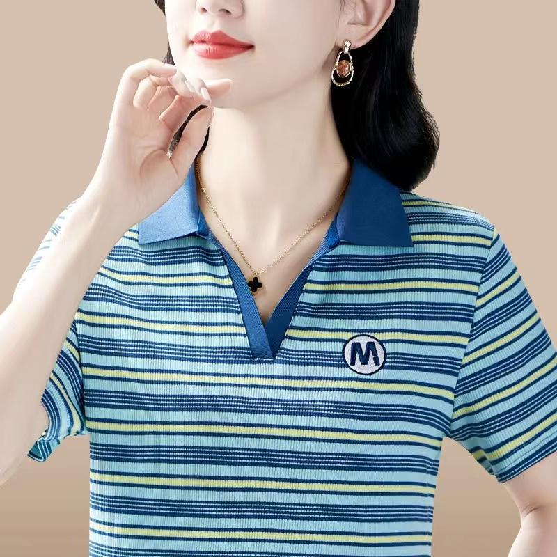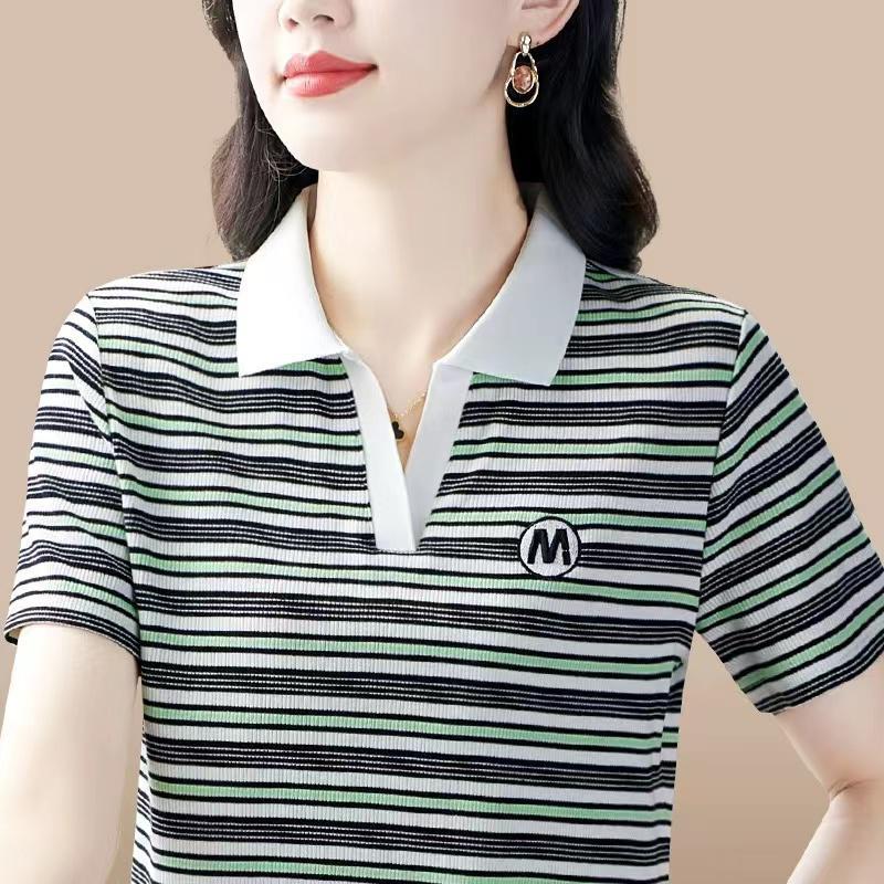 | nameOriginal | Lar T-shirt Mom's Short-sleeved Small V-neck Casual Top for Middle-aged Women's Western Style Age-reducing Slimming Striped Contrast Base Shirt |