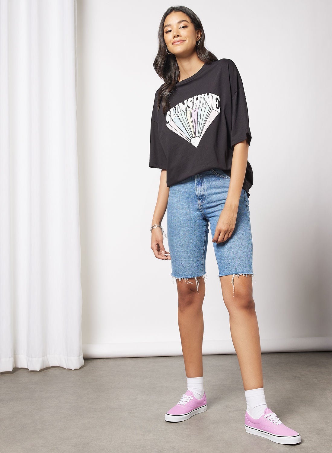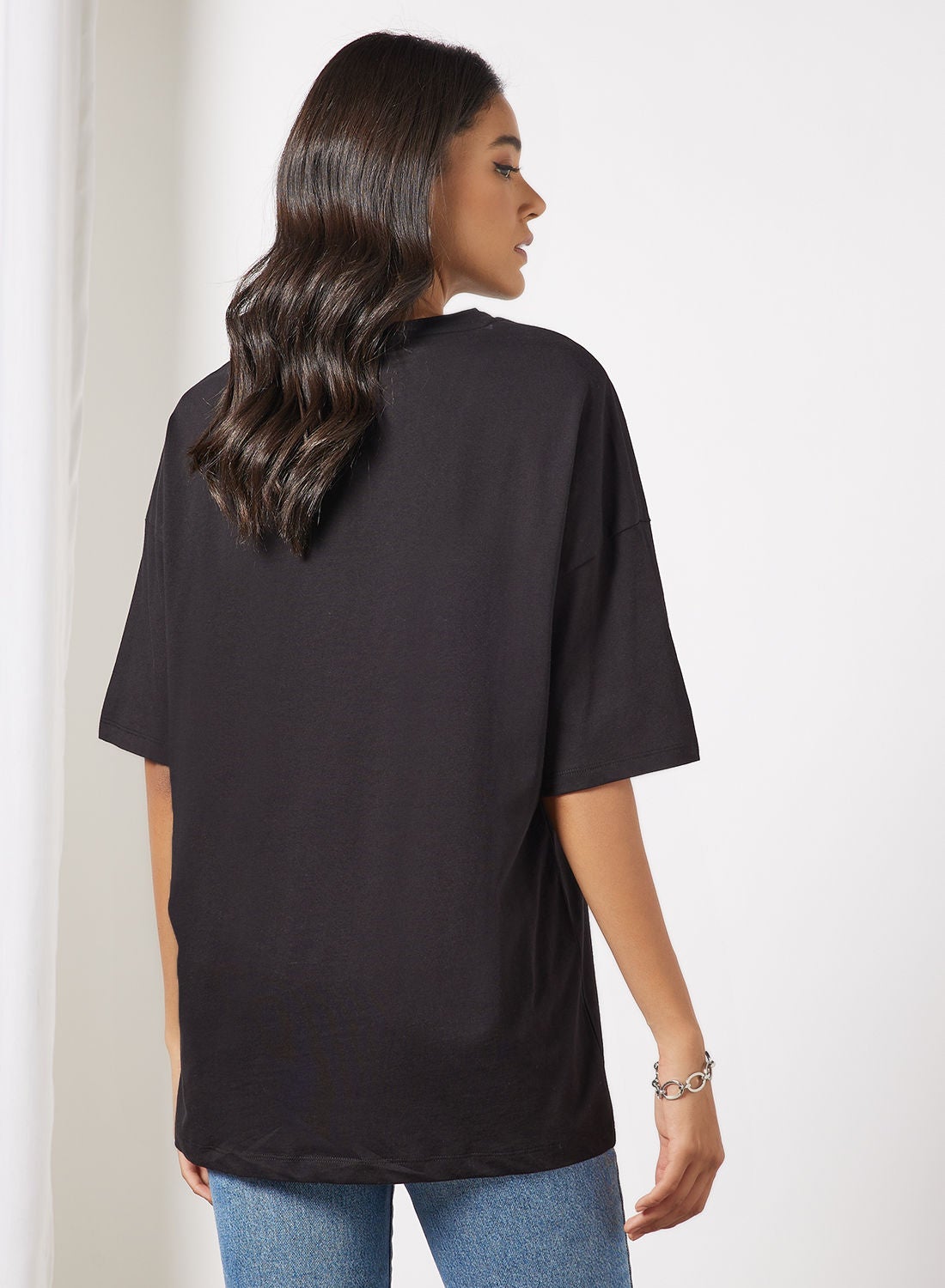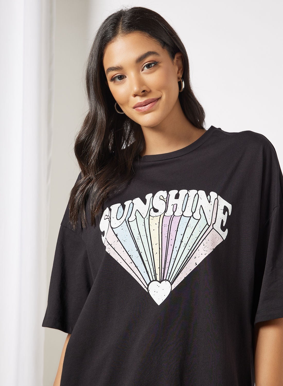 This product boasts a cozy cotton material that feels gentle on the skin. It features a striking design with a contrasting graphic and text print on the front. The round neckline and short sleeves provide a classic look. To ensure the longevity of the product, please follow the washing instructions on the care label. The model in the image is approximately 179 cm tall and is wearing a size S.