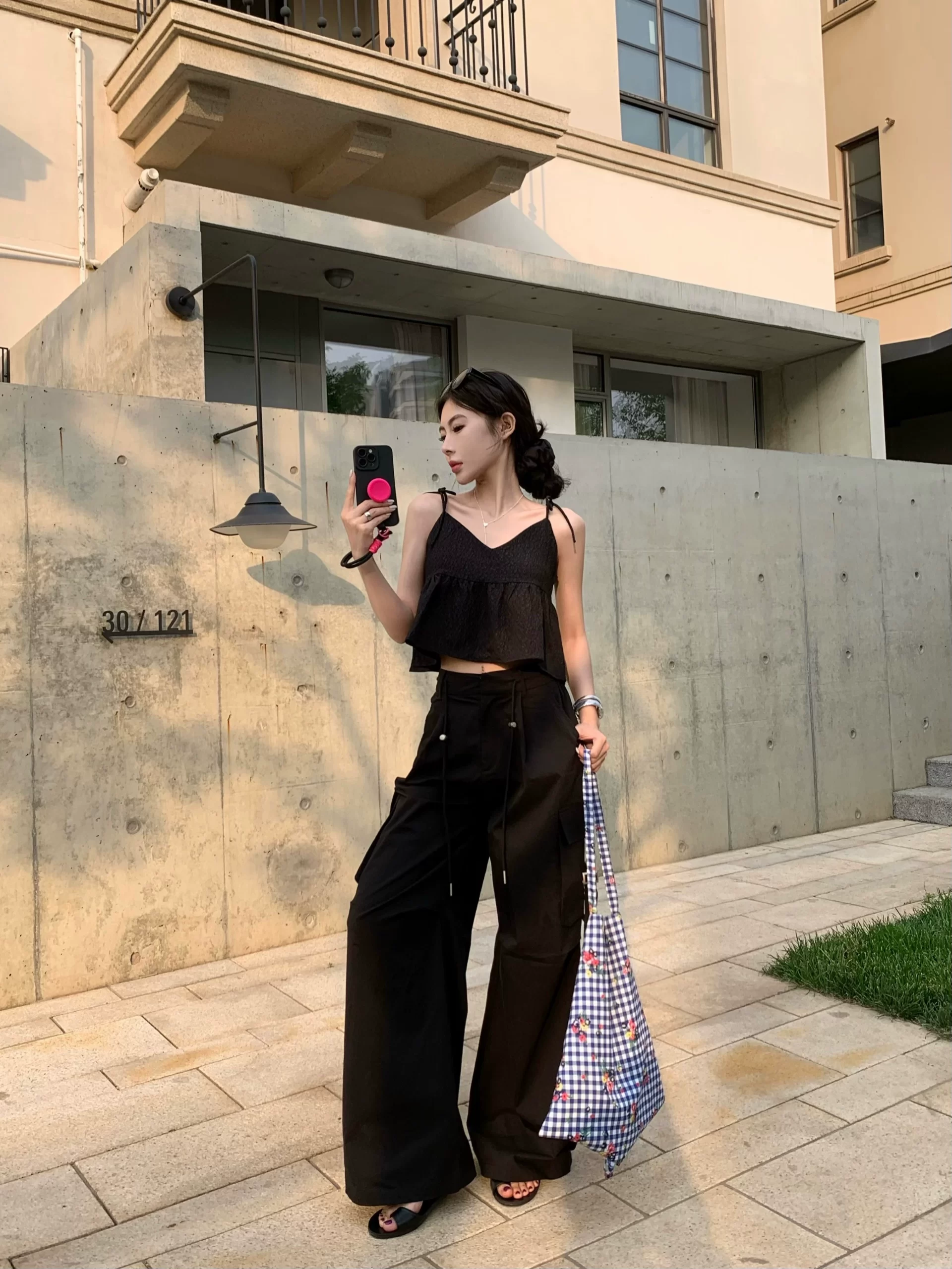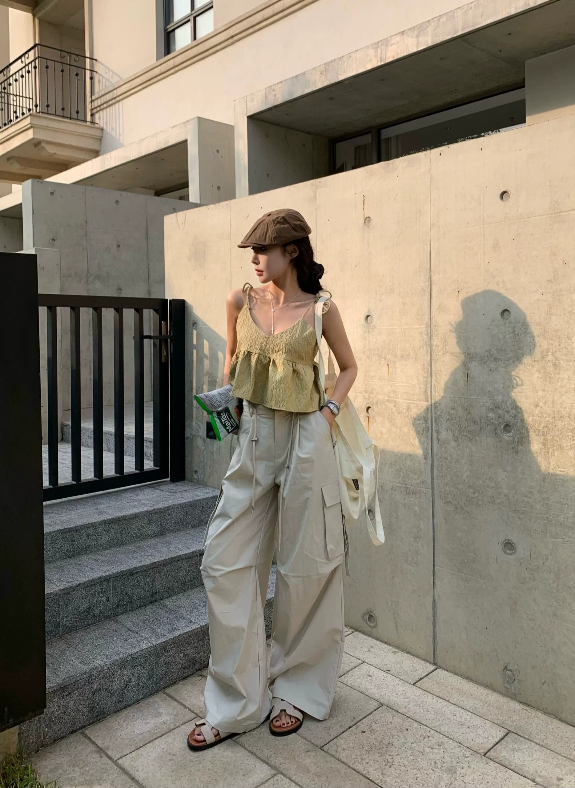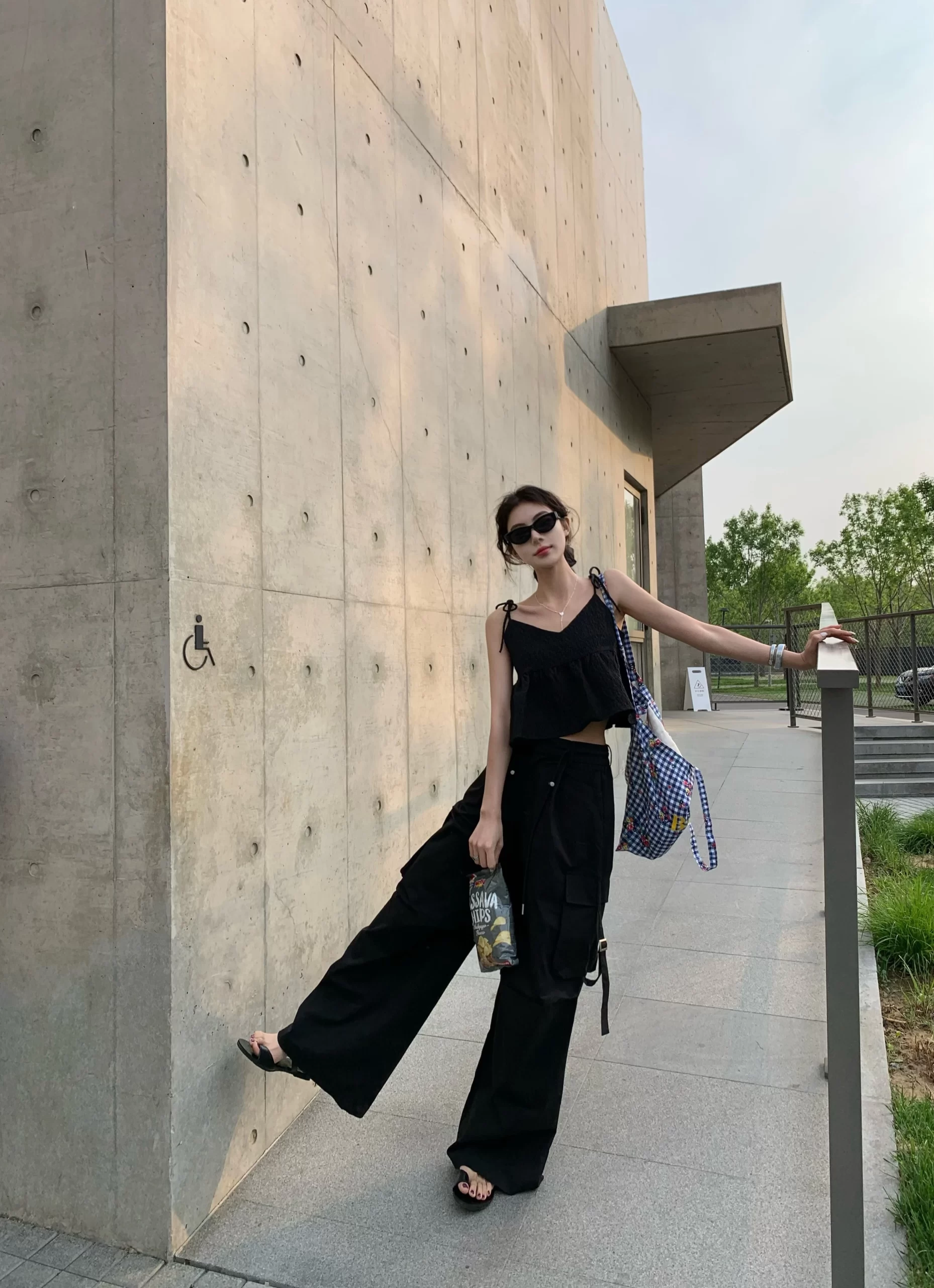 | nameOriginal | Large pockets, high waisted drawstring, loose floor-length trousers overalls |