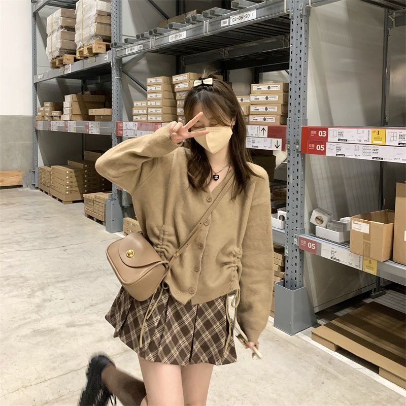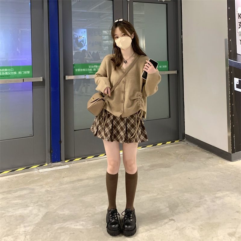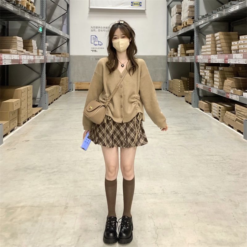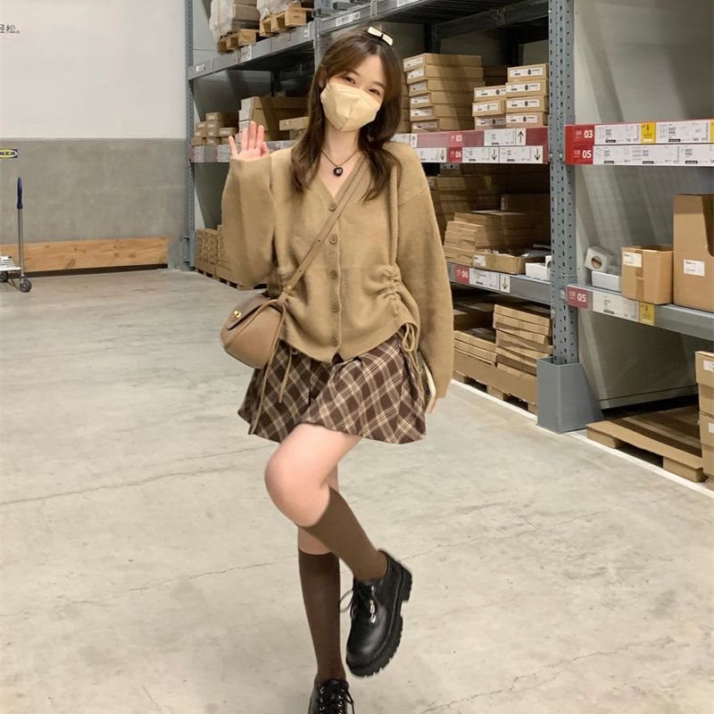 | nameOriginal | Large Size Autumn Women's Clothing Cute Style Design Drawstring V-Neck Knitted Autumn High Waist Slimming Plaid Pleated Skirt |