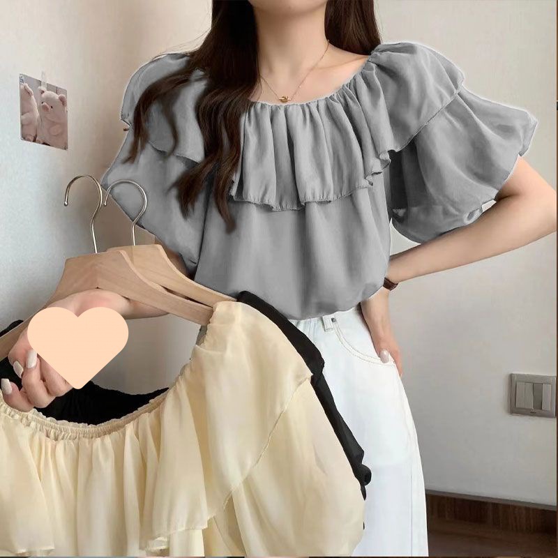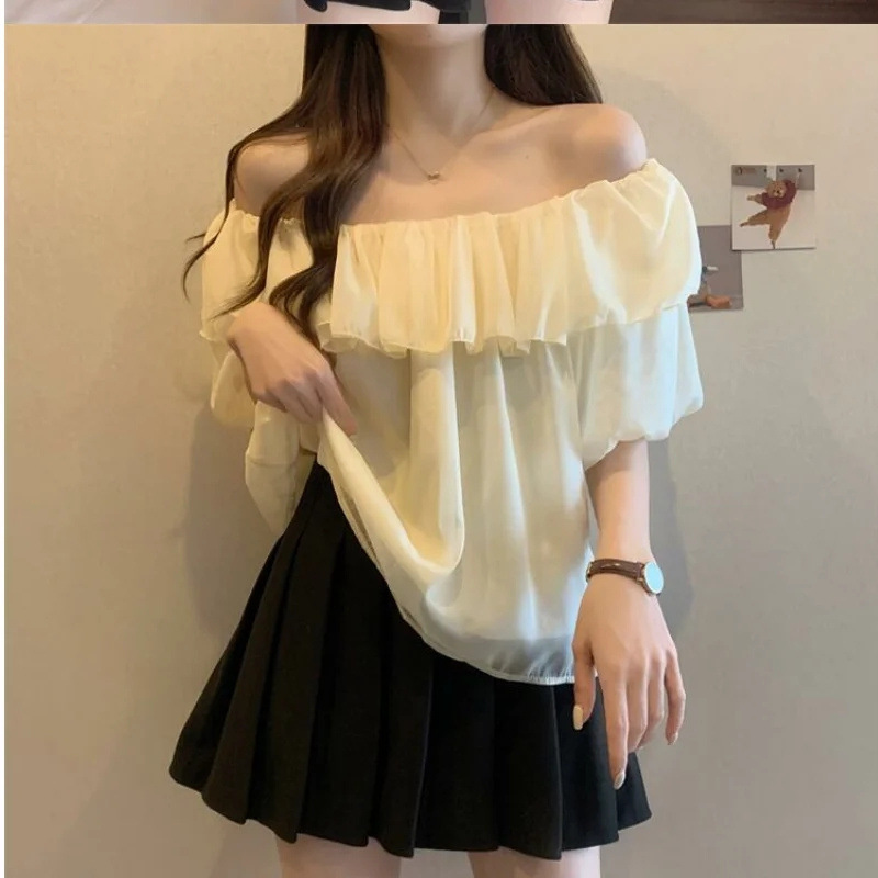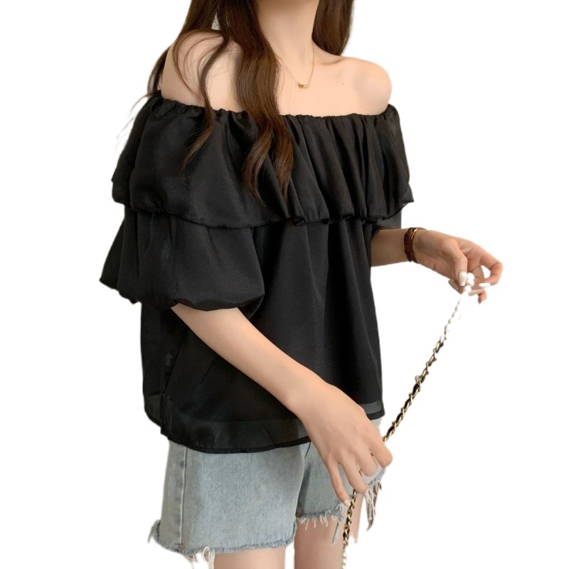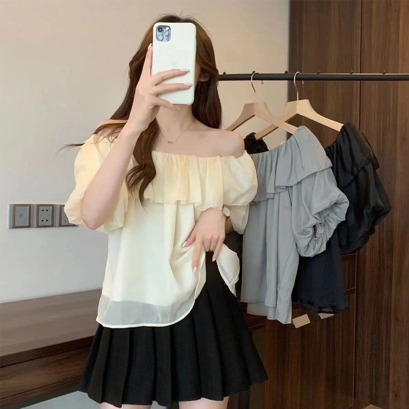 | nameOriginal | Large size chubby French sexy off-shoulder ruffled short sleeve chiffon shirt women's summer minority design feeling slimming top |