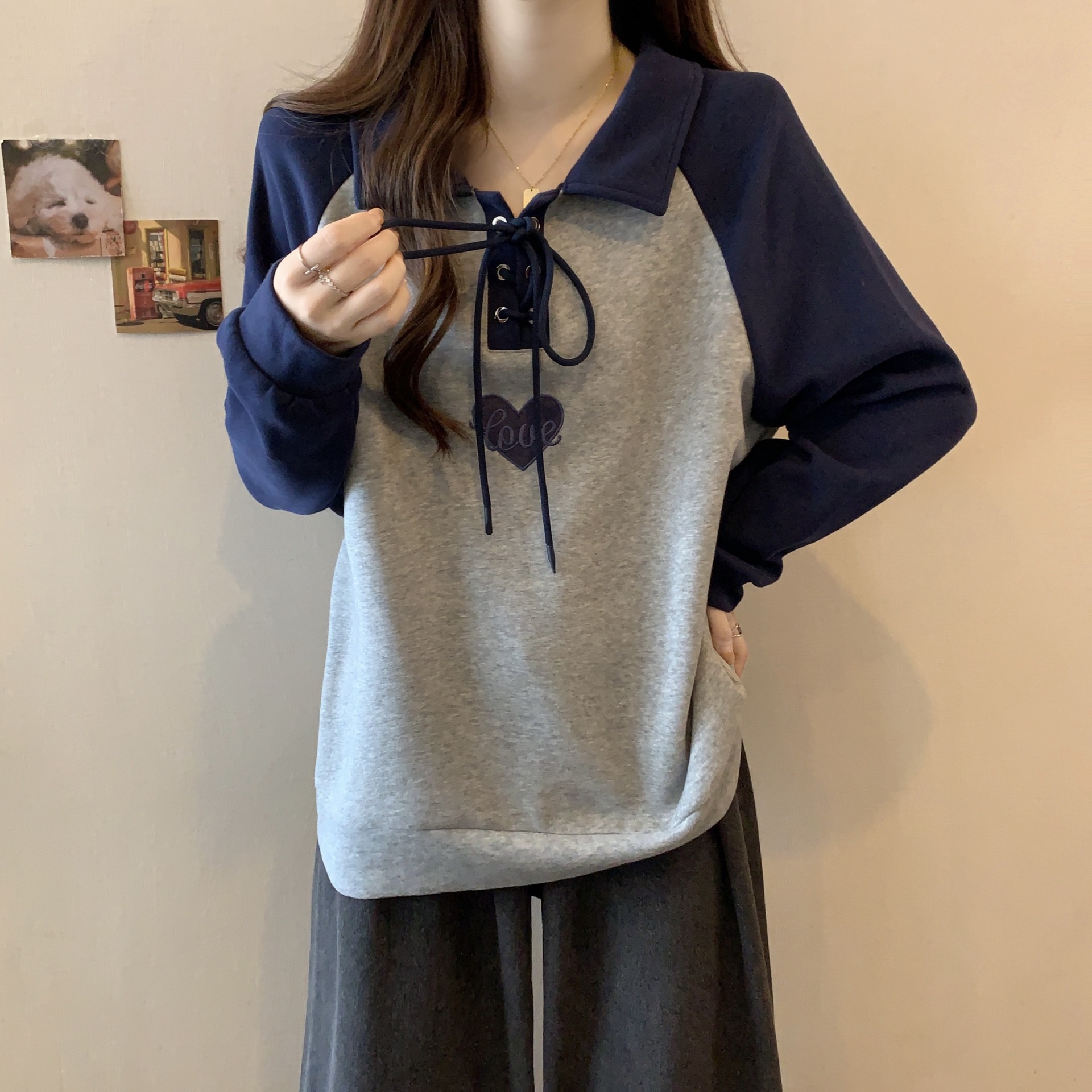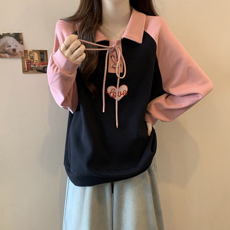 Large Size College Style Polo Collar Raglan Long Sleeve Sweat Women’s Spring Loose Slimming Design Casual Top for Chubby Girls