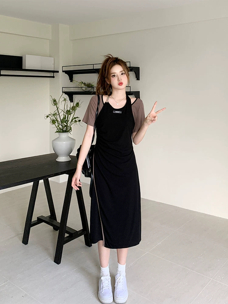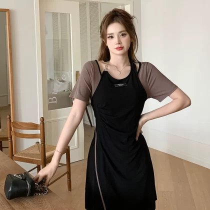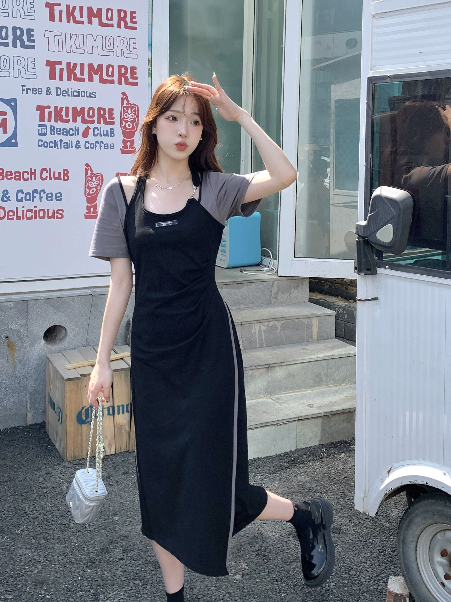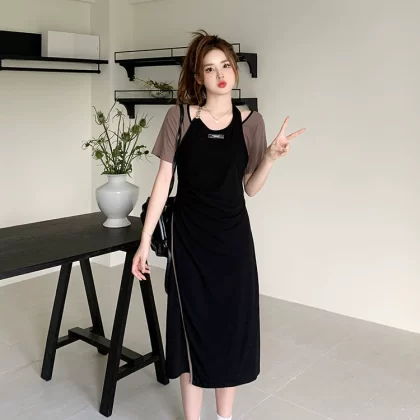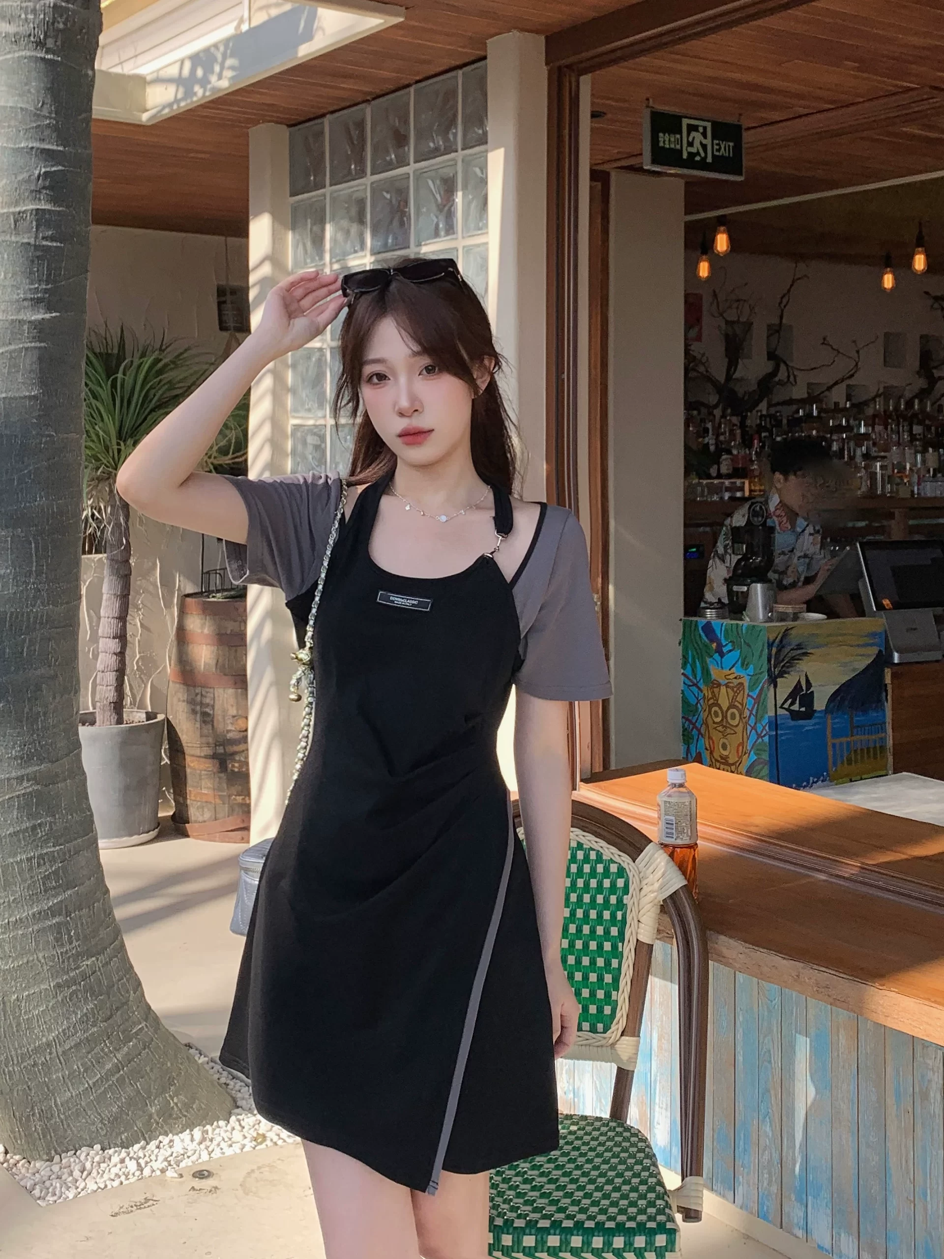 | nameOriginal | Large size French halterneck fake two-piece dress for women summer 2024 new skirt for fat mm to cover belly and look slimming long skirt |
