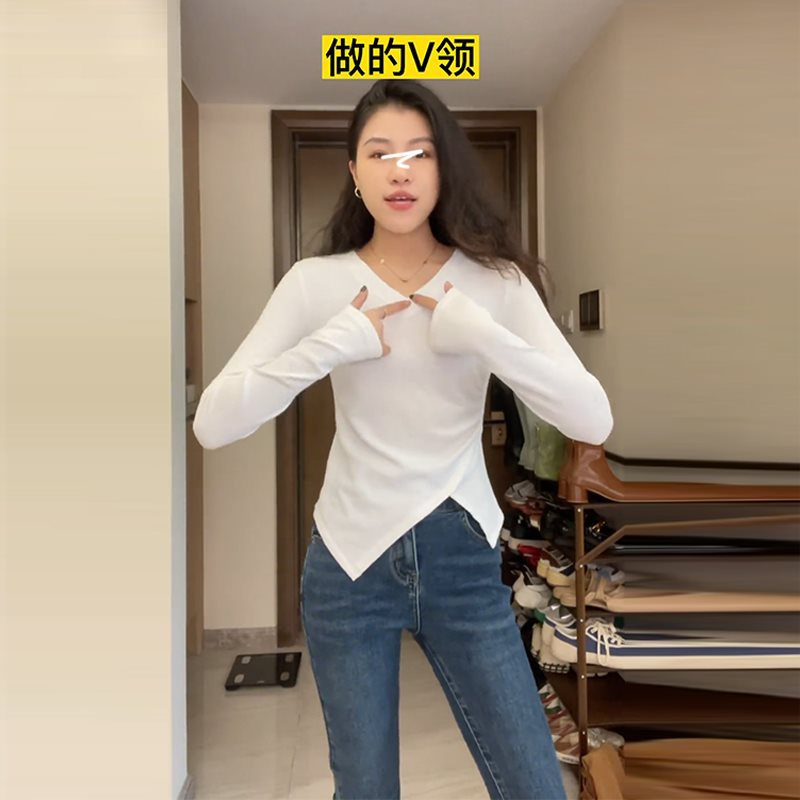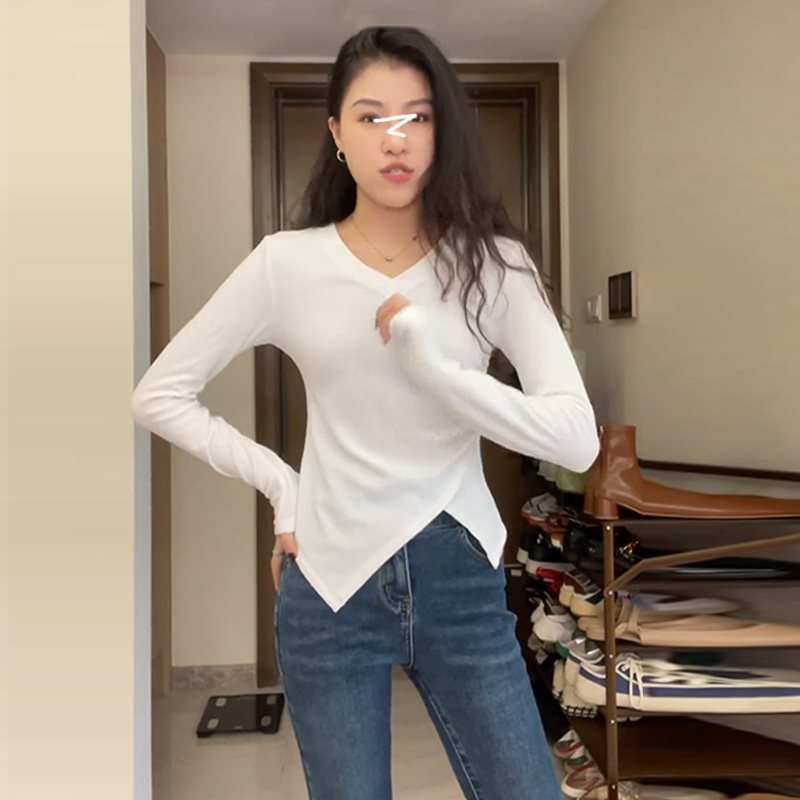 | nameOriginal | Large Size Irregular Chic Base Shirt Women's Spring and Autumn Inner Slimming Slim-fit Slim-fit Tight Waist Split T-shirt V-neck Top |