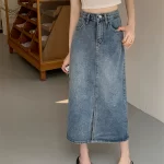 Large size slit denim skirt for fat mm that covers belly and looks slimming