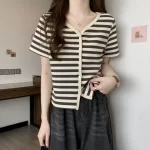 | nameOriginal | Large size V-neck striped short-sleeved sweater for women summer new fat mm loose short style slimming belly-covering top that hides fat |