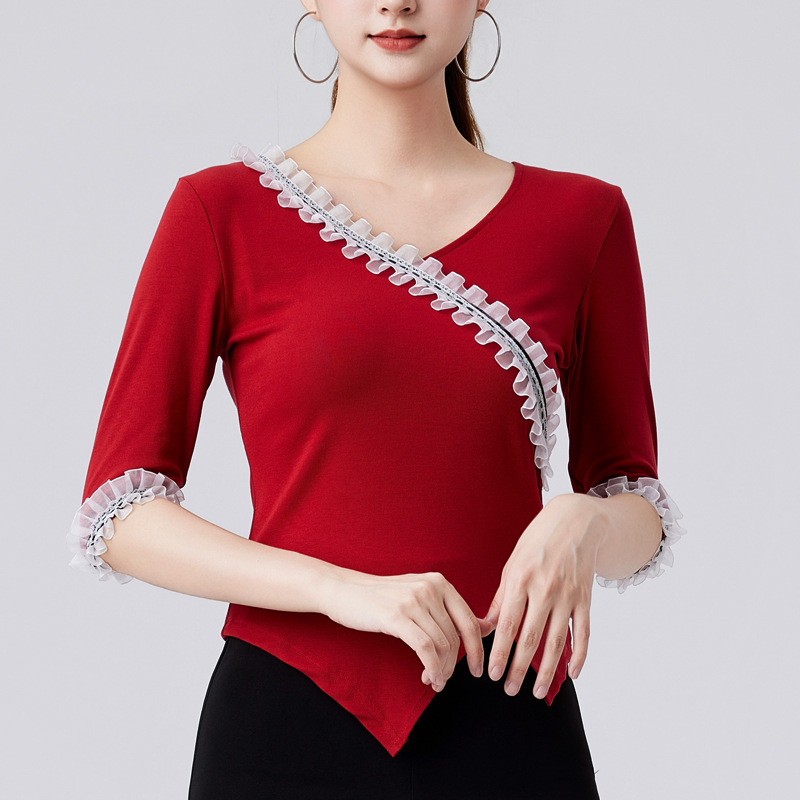 Latin Dance Top Women’s New V-neck Modern Dance Costume Ruffled Dance Costume Mid-sleeve Ballroom Dance Practice Suit Summer