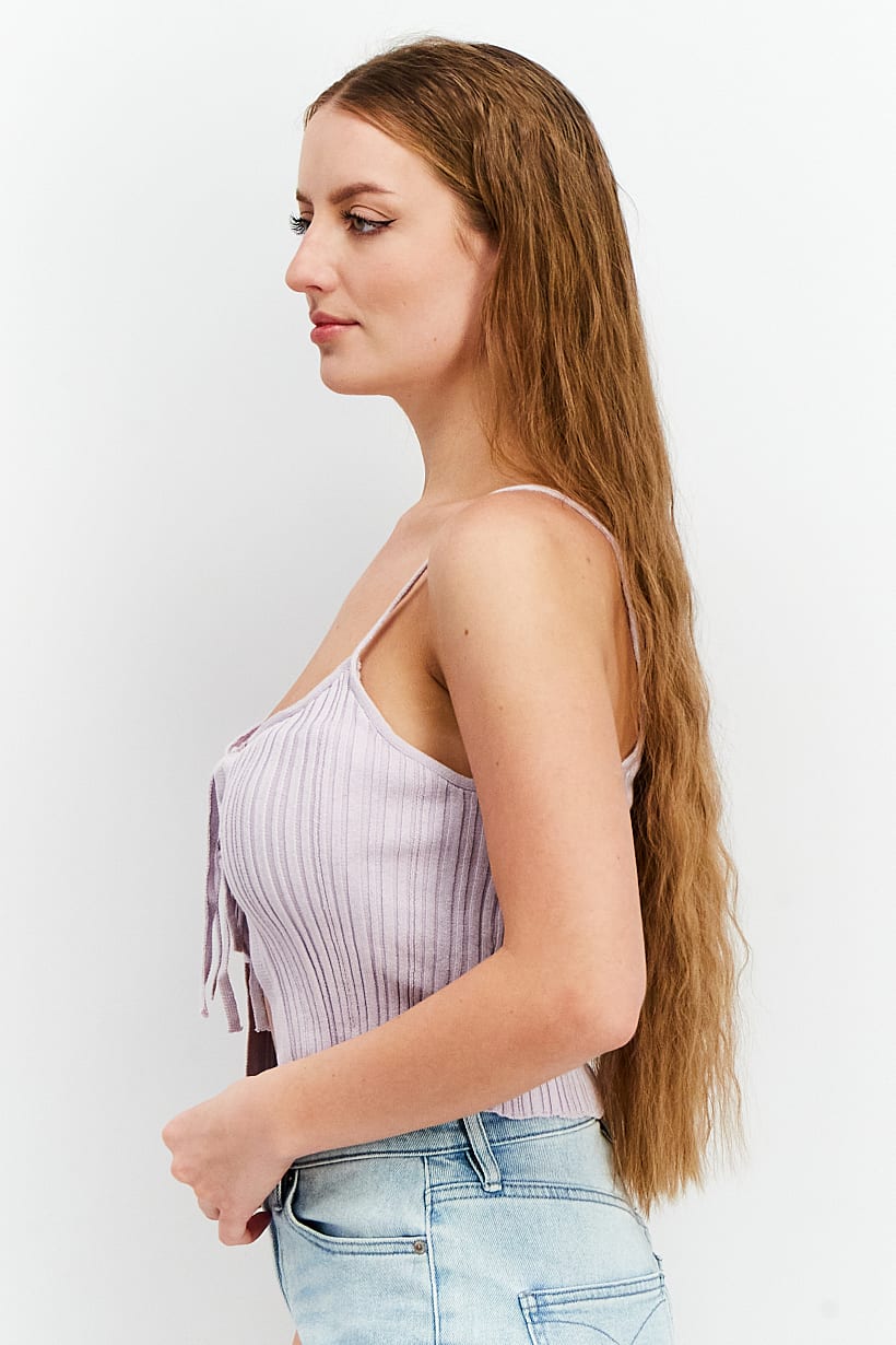 This product is designed for women and features a regular fit. It is a camisole style top with a straight hem and sleeveless design. The neckline and collar are tied, and the closure is also a tie. The fabric is 100% cotton with a textured pattern in a lovely lavender color. It is ideal for casual occasions and can be machine washed. Please note that the product color may vary slightly due to lighting or monitor settings.