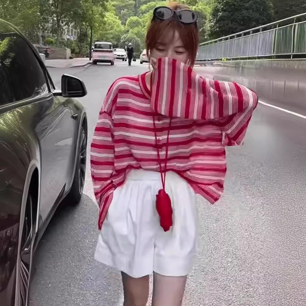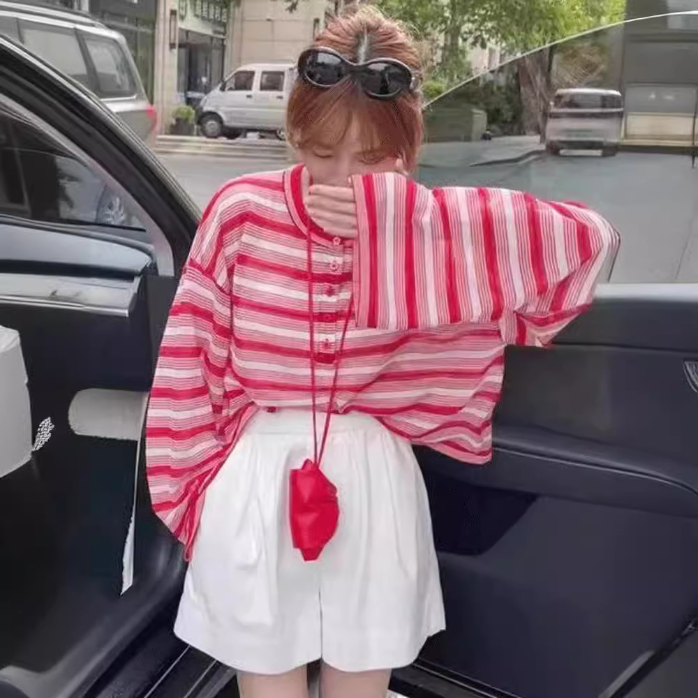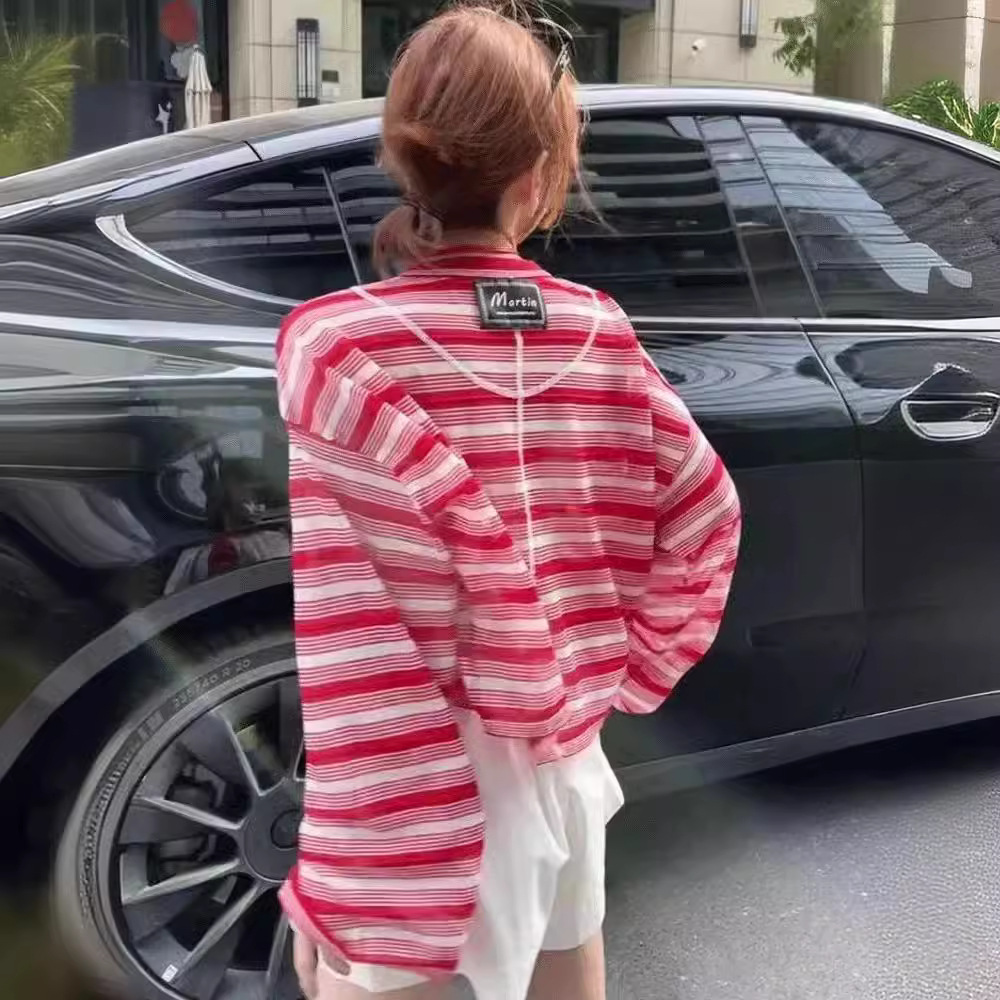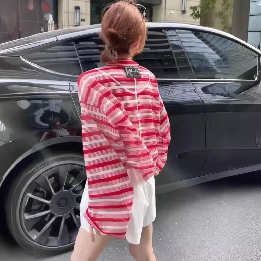 | nameOriginal | Lazy Relaxation Thin Striped Long-sleeved T-shirt Women's Summer Loose Short Outer Sunscreen Ice Silk Blouse Top |