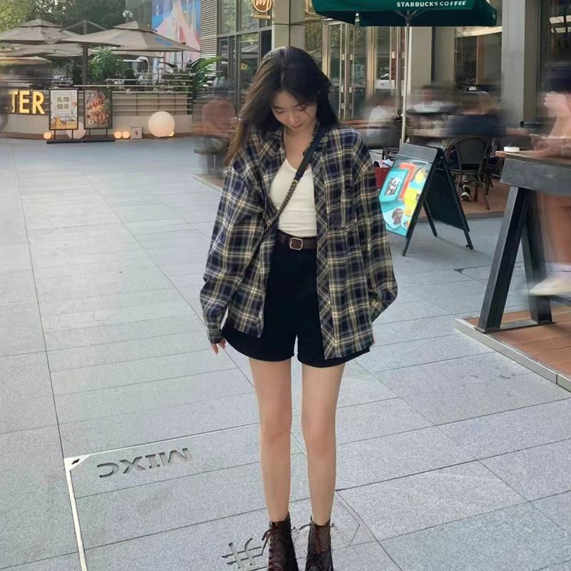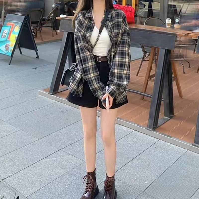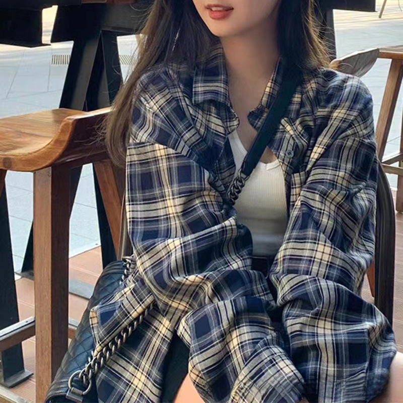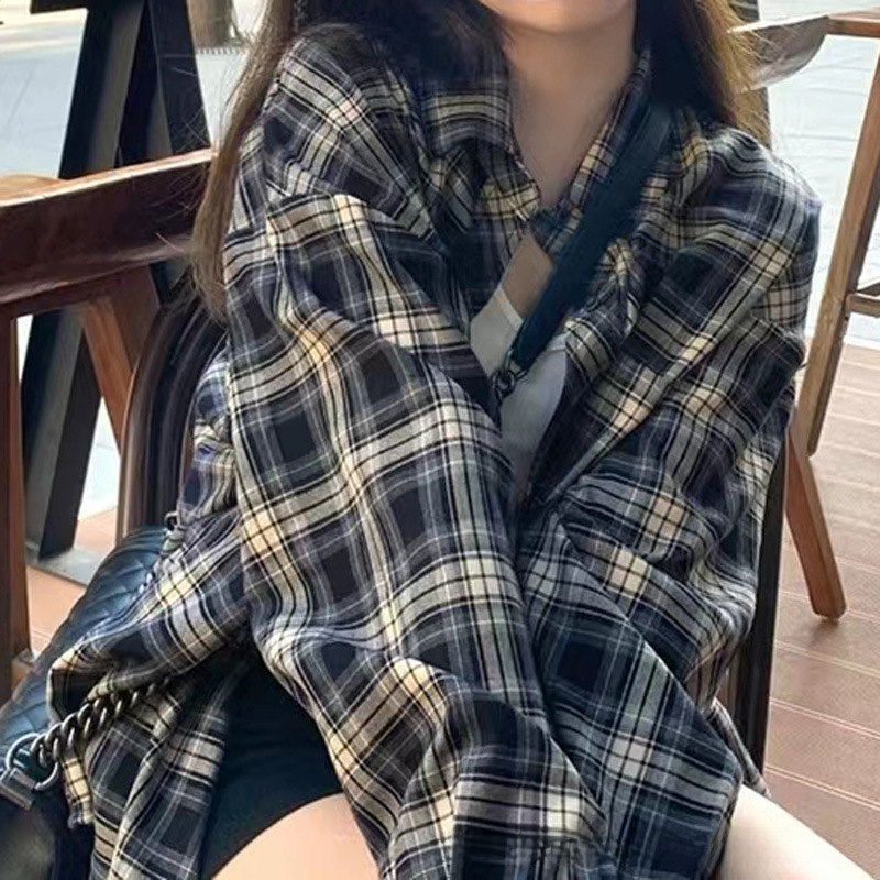 Lazy retro mid-length plaid loose women’s shirt versatile casual thin fashionable temperament long sleeve coat sun protection