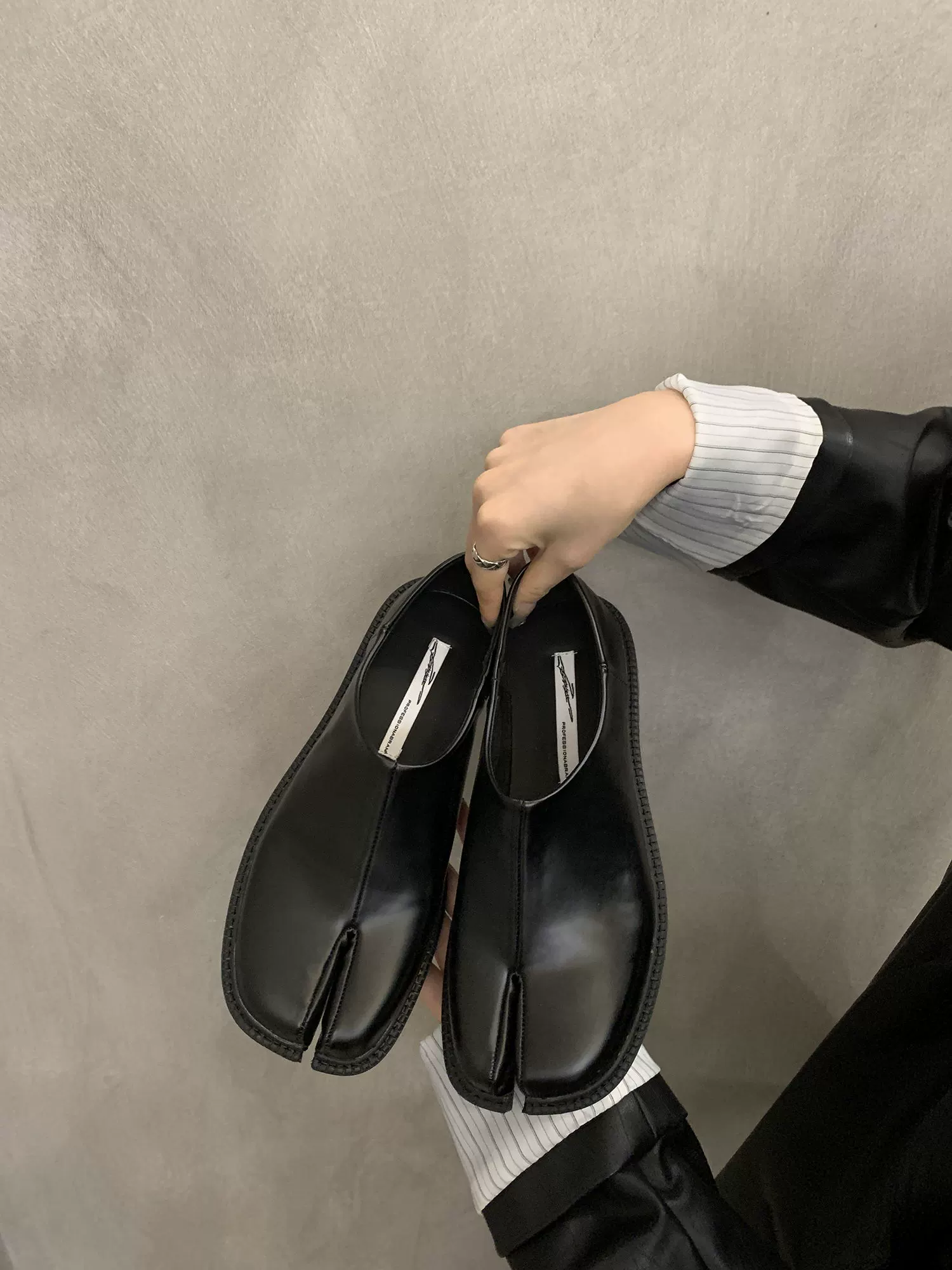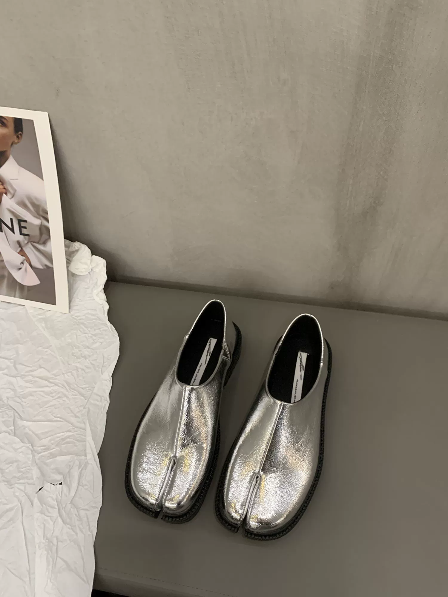 | nameOriginal | Lazy retro pig's trotter silver slip-on split-toe shoes |