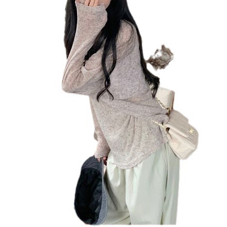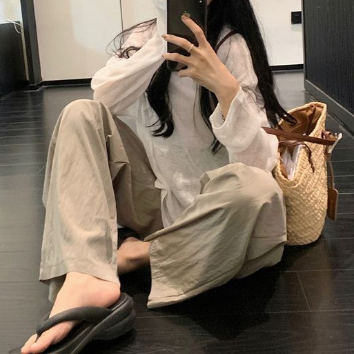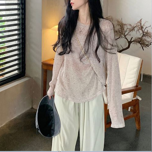 Lazy Style Casual Thin Sunscreen Long-sleeved T-shirt Women's Summer Niche Slimming Chic Grey Round Neck Top in Trendy