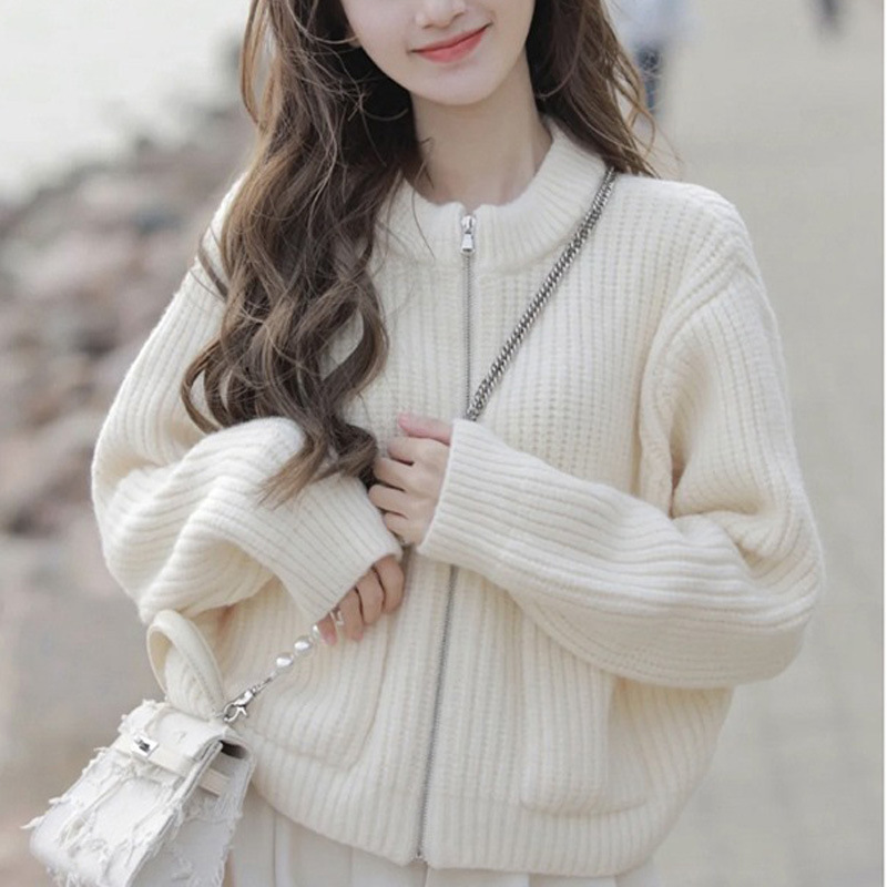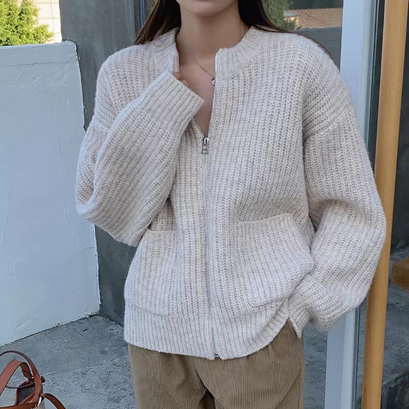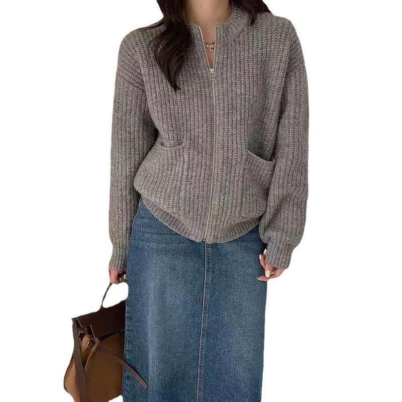 Lazy Style Knitted Cardigan Women's Loose Double Pocket Autumn and Winter New Korean Style Slimming Zipper Round Neck Sweater Women's Coat