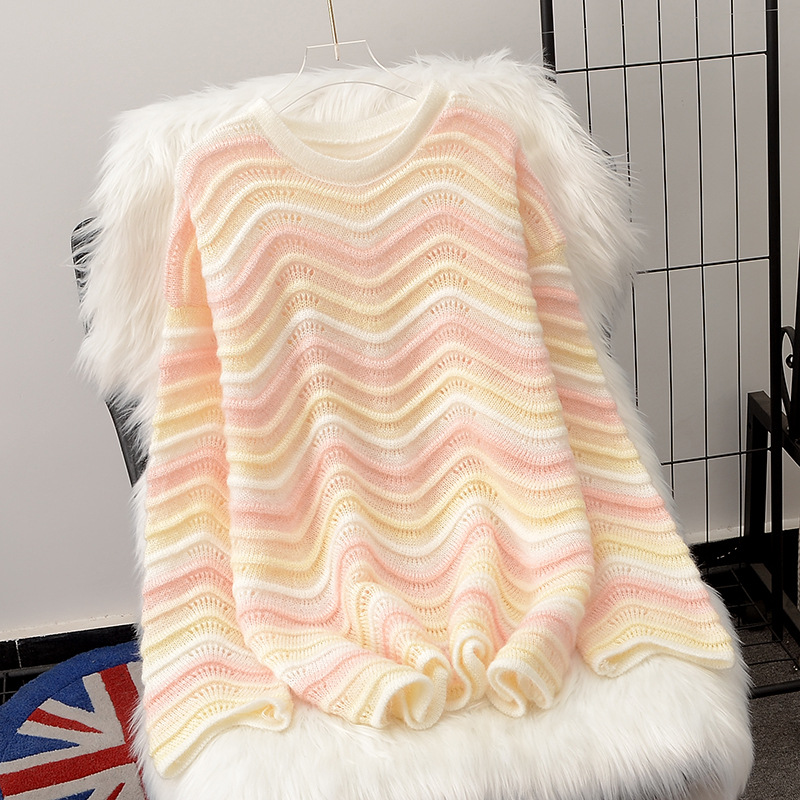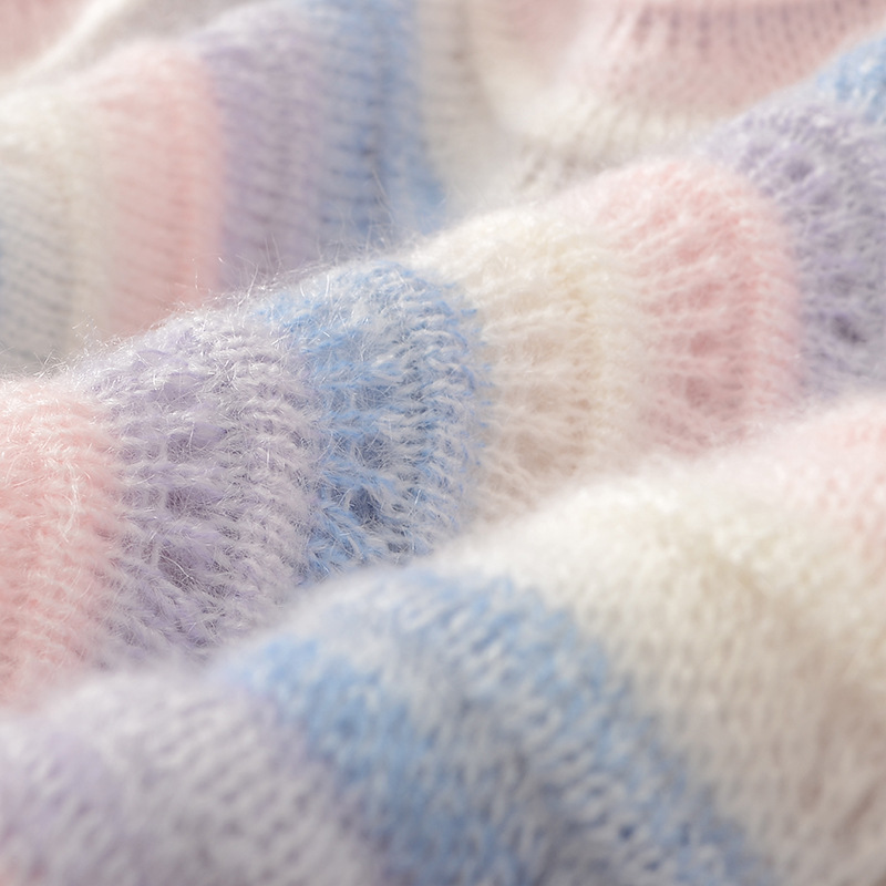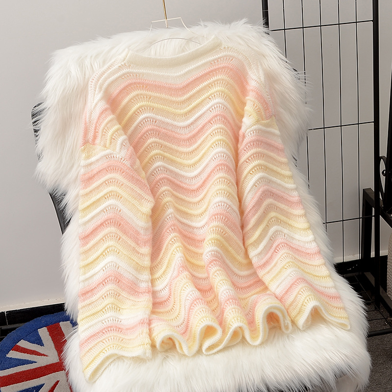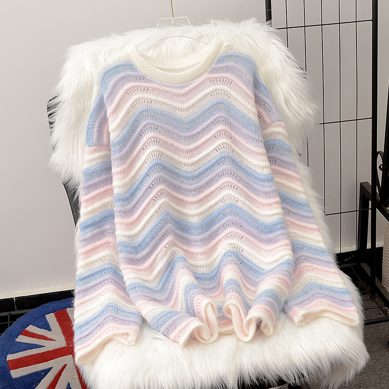 Lazy Style Rainbow Striped Mohair Sweater Women’s Autumn and Winter New Loose Western Style Contrast Color Round Neck Pullover Sweater