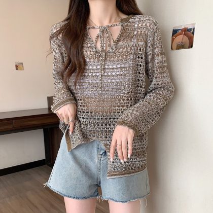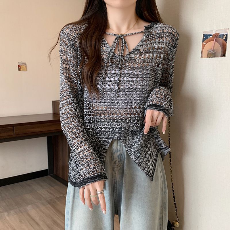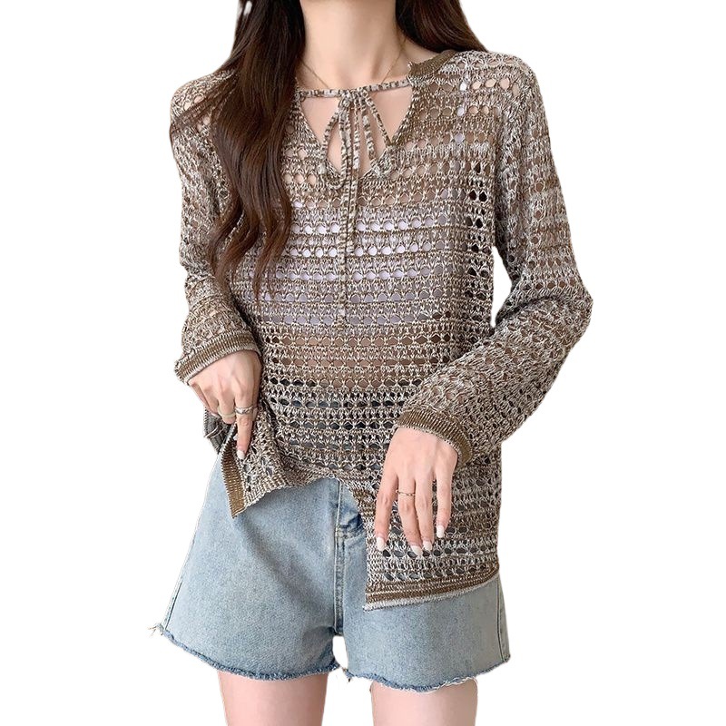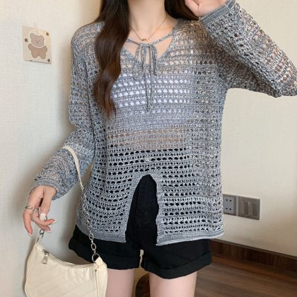 | nameOriginal | Lazy Style Thin Collar Sunscreen Blouse Women's 2024 Summer New Pullover Split Loose Hollow Top Outer |