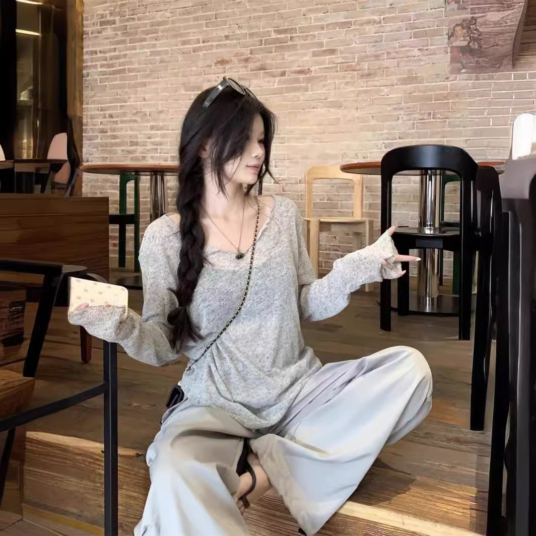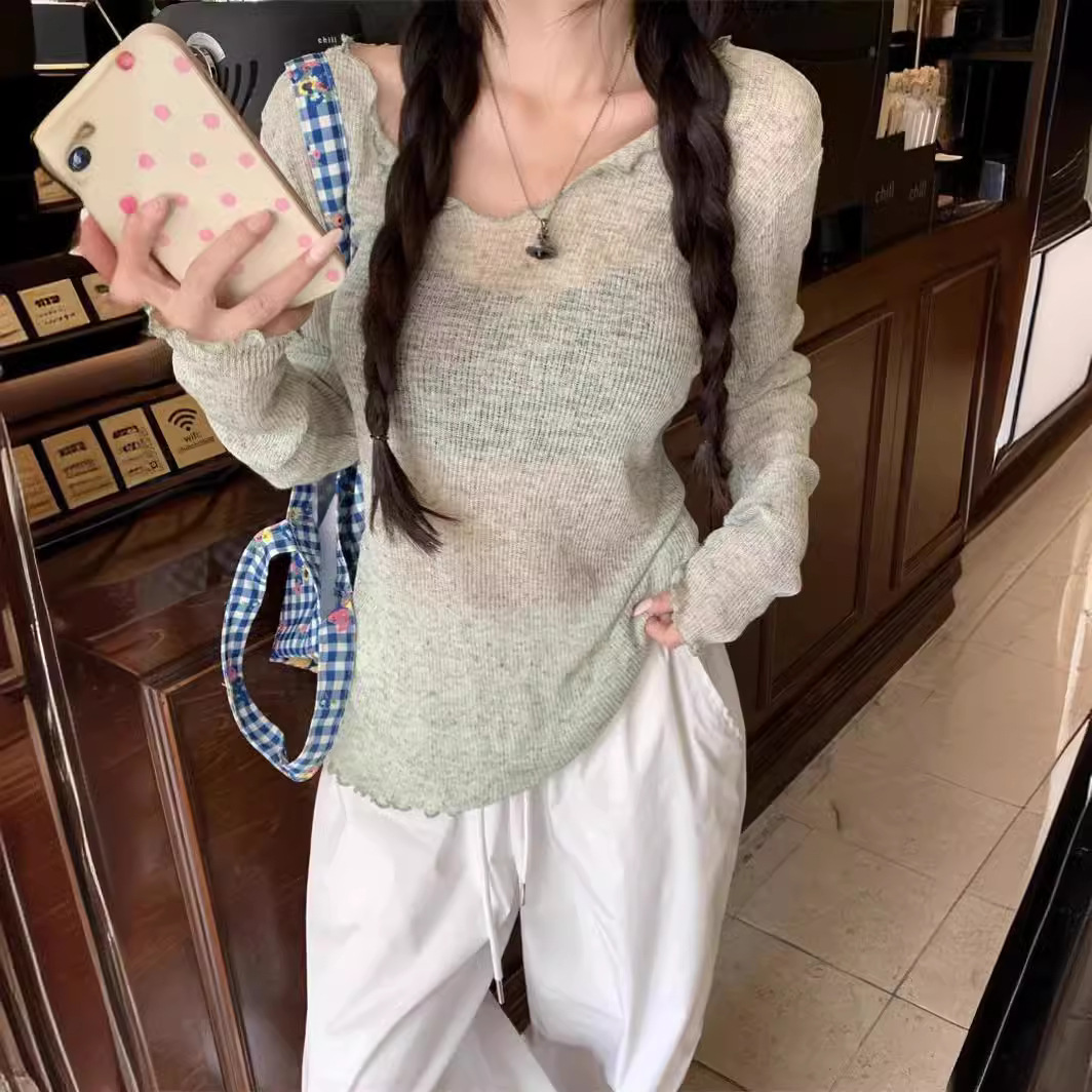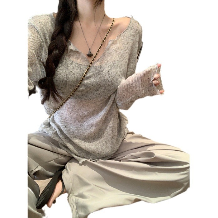 | nameOriginal | Lazy Style Thin V-neck Micro-transparent T-shirt Women's 2024 Summer New Loose Casual All-match Blouse Sunscreen Top |