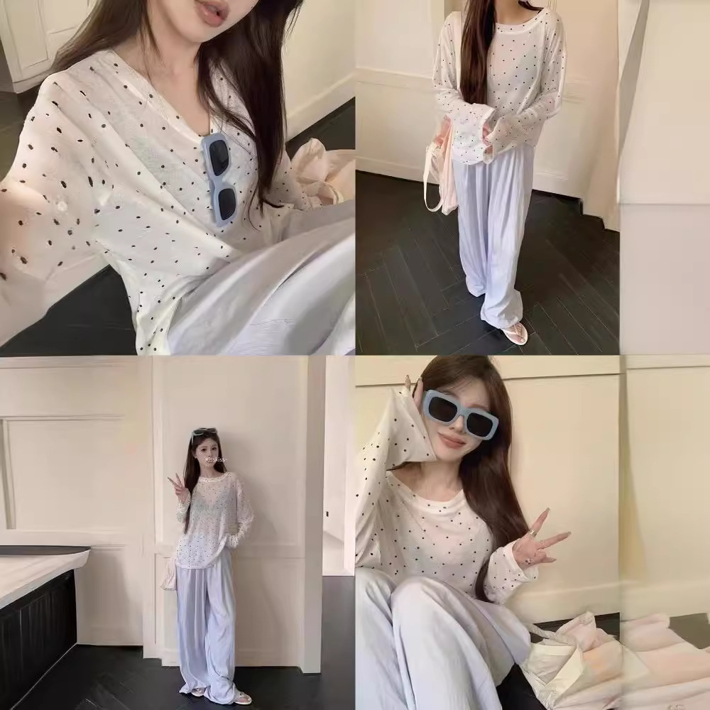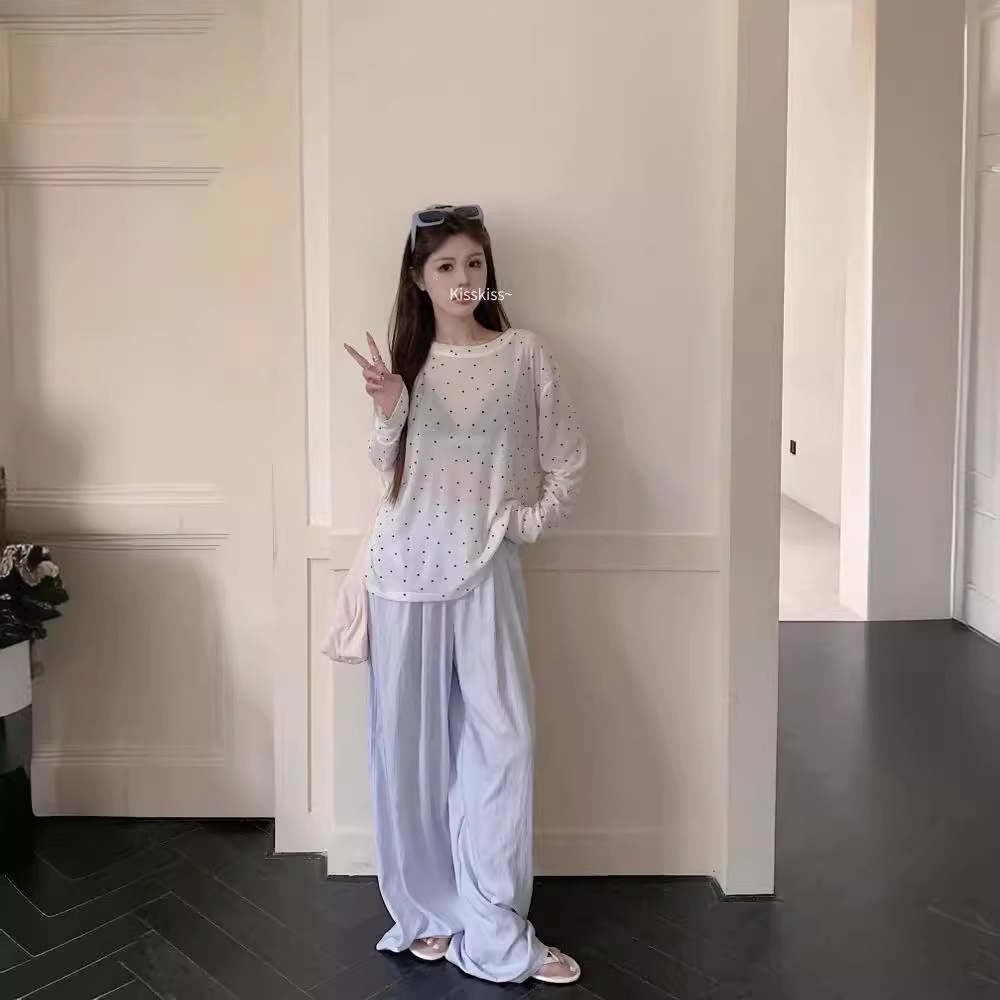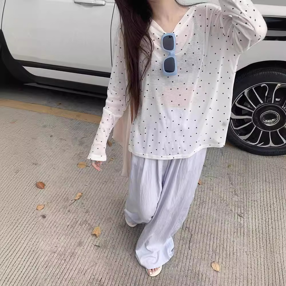 | nameOriginal | Lazy Style White Micro-transparent Wave Dot Long-sleeved T-shirt Women's Summer 2024 New Loose Thin Sunscreen Blouse Top |