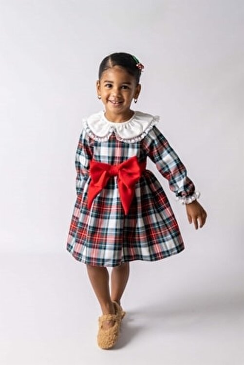 Girls’ dress with plaid pattern collar flare with red bow on the front Suitable for everyday and special day use. Fabric content