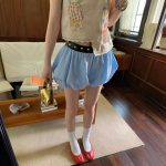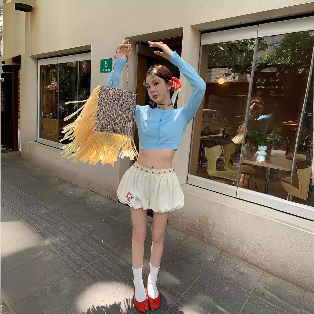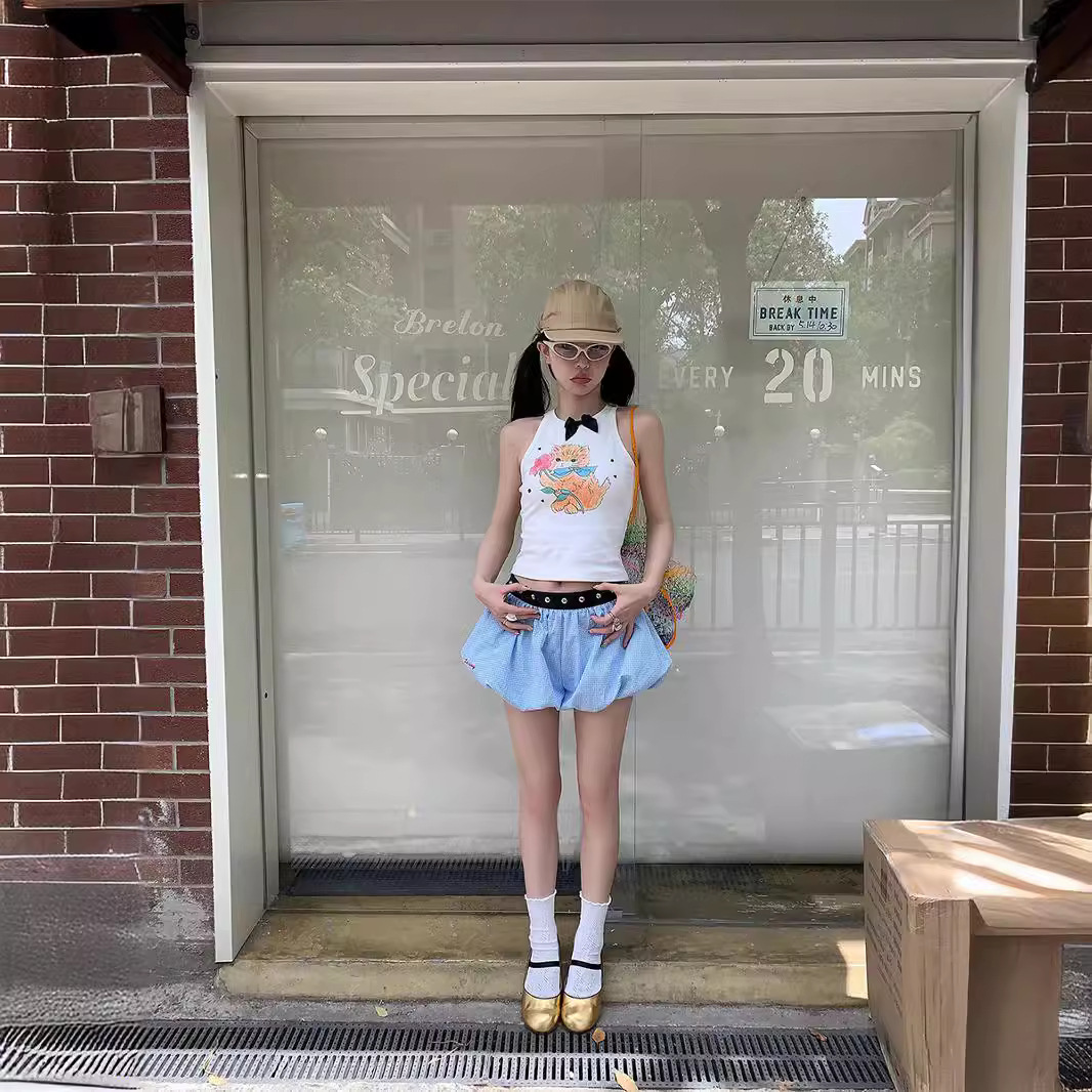 | nameOriginal | le rouge zhou meimei summer bubble blue and white plaid apricot rivet belt puffy embroidered flower bud shorts |