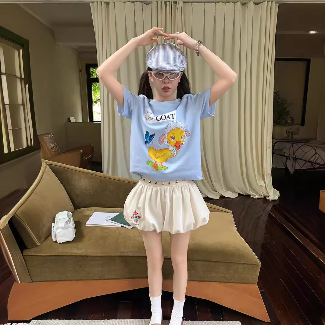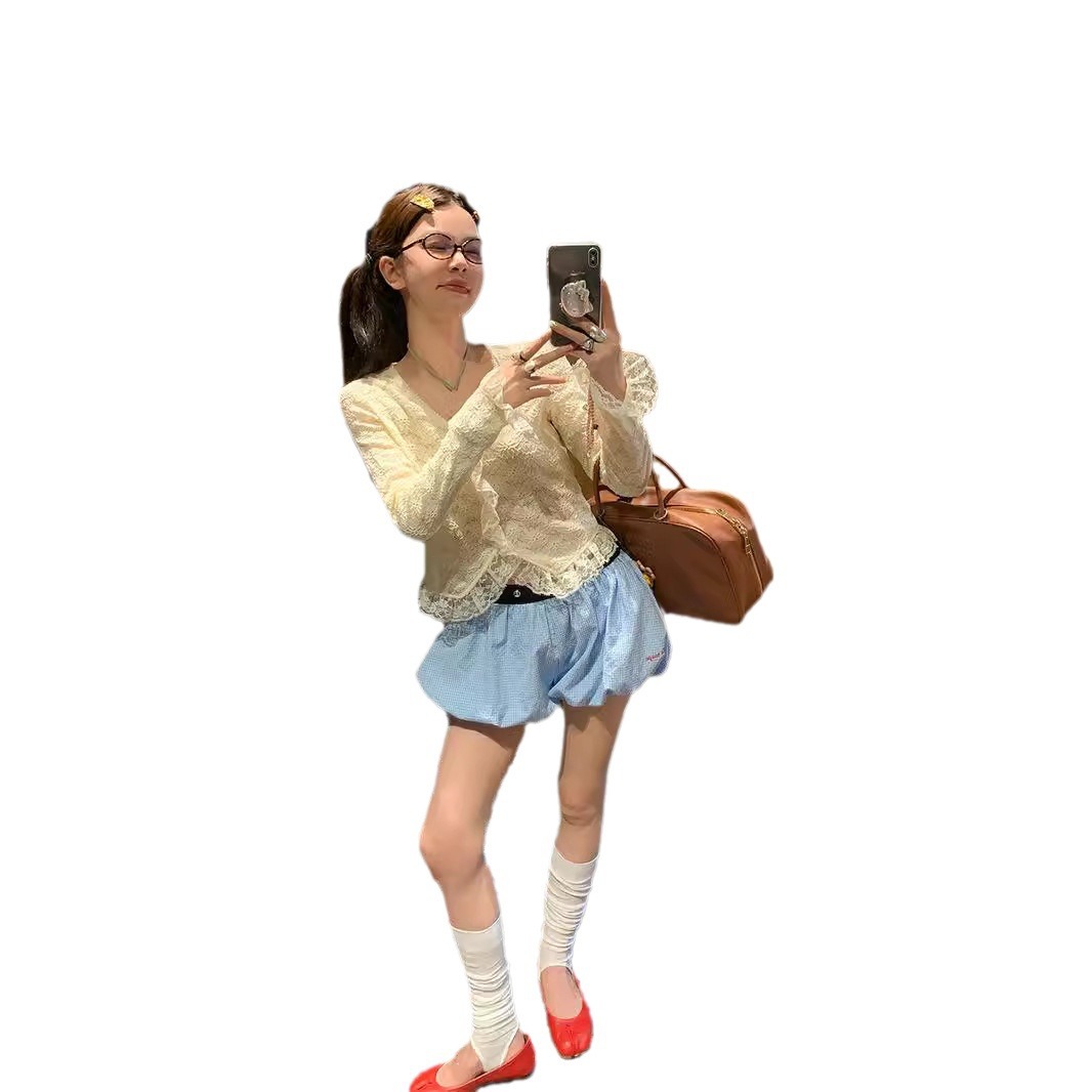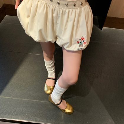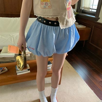 | nameOriginal | le rouge zhou meimei summer bubble blue and white plaid apricot rivet belt puffy embroidered flower bud shorts |