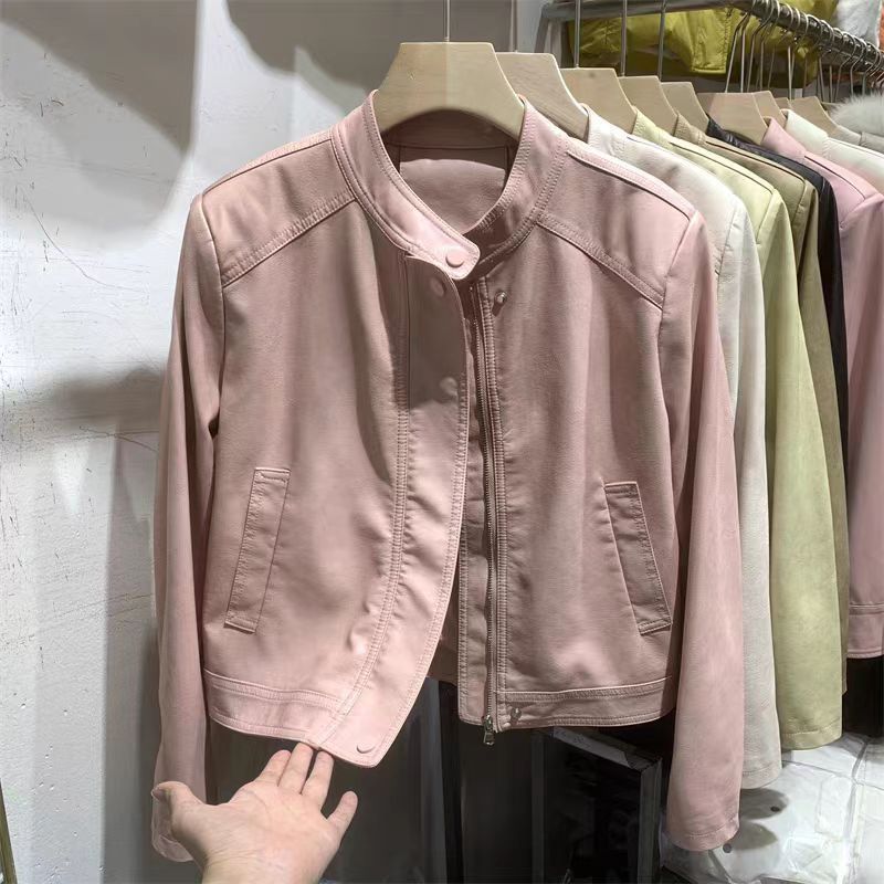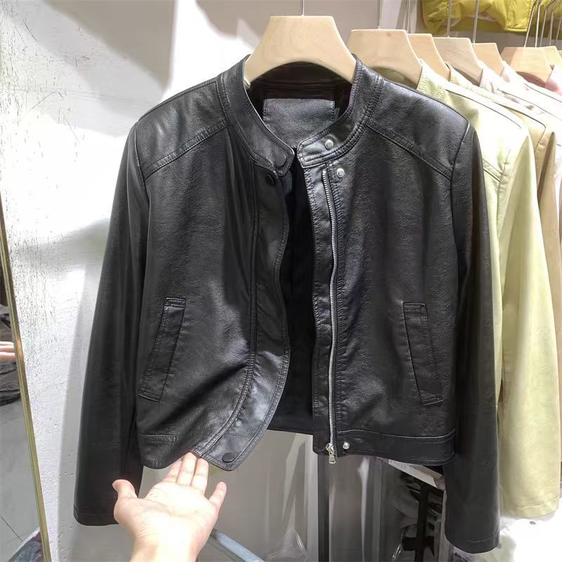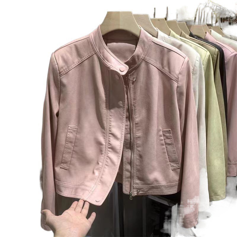 Leather Women's 2024 New Casual Short Top Loose Slimming Fashion All-match Leather Jacket Round Neck Short Coat