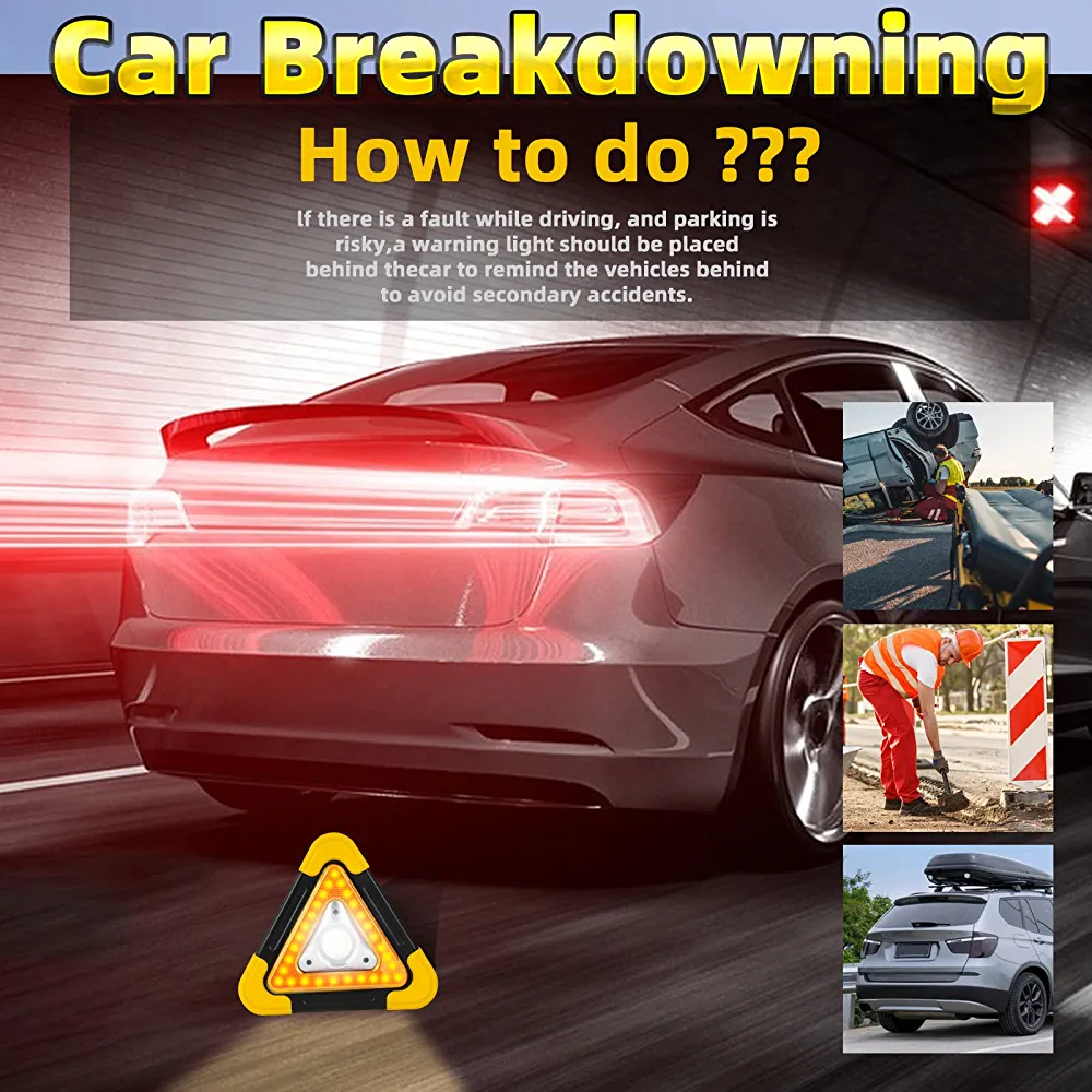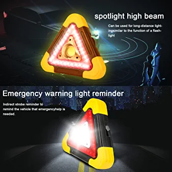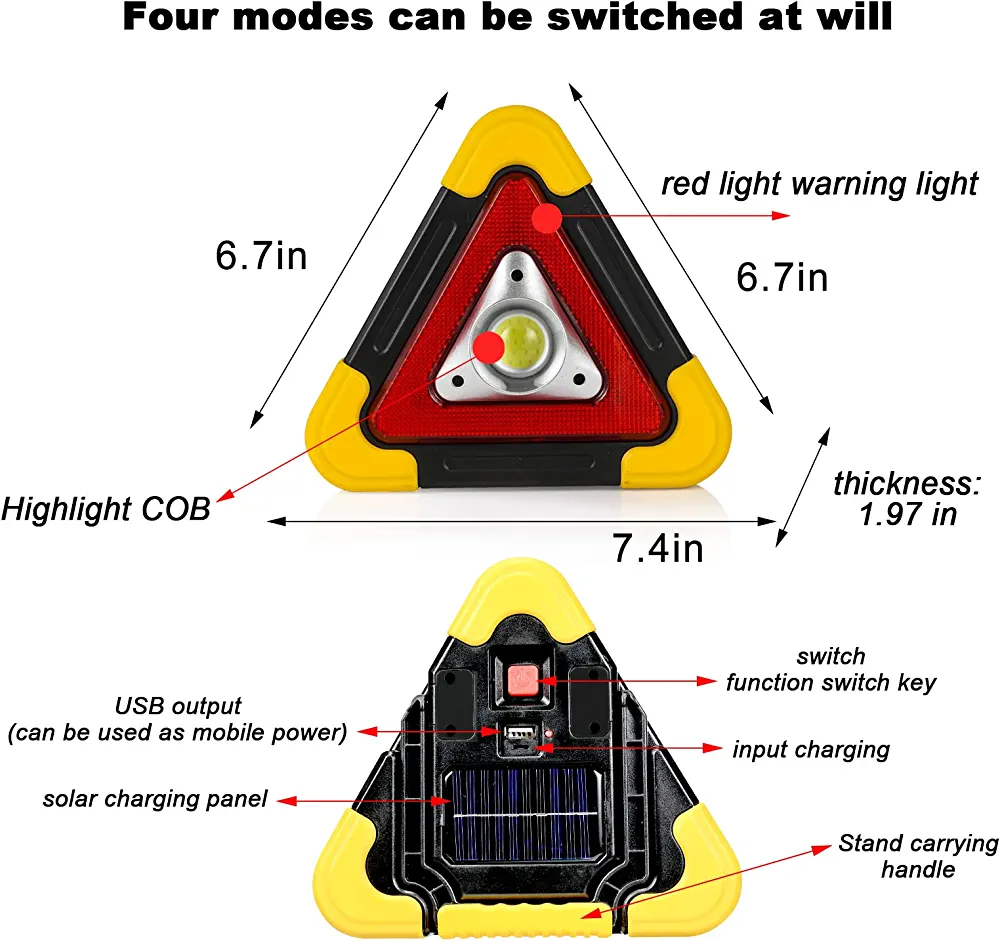 This car-mounted triangle warning sign is a versatile and practical tool that offers four different modes to meet various needs in different scenarios. It can provide far light, wide light, fault warning reminder, and emergency warning reminder functions. The sign can be charged via USB or solar power, making it easy and convenient to use.