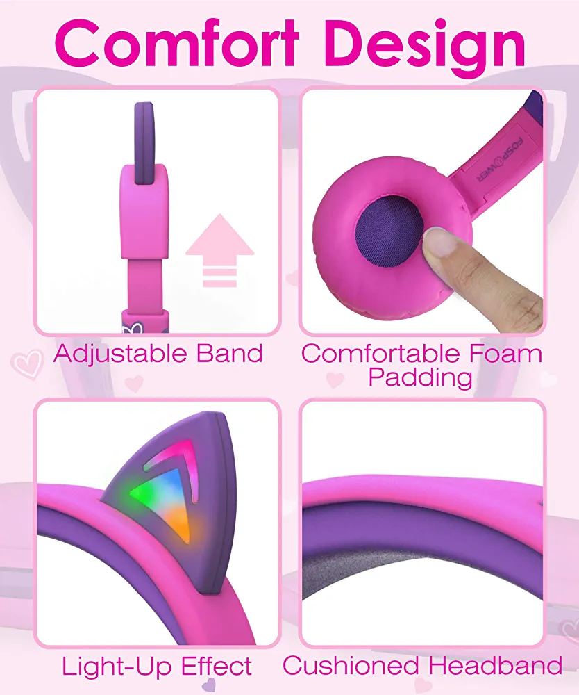 | nameOriginal | FosPower Kids Headphones with LED Cat Ears, 3.5mm On-Ear Wired Headset with Laced Cables for iPad/Smartphones/PC/Kindle/Tablet/Laptop/School (Max Volume 85dB) – Hot Pink/Purple |