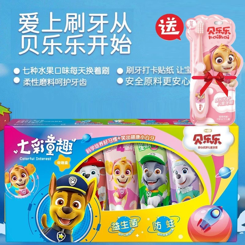 Lengsuanling Beilewangwang team jointly branded 7-color children's toothpaste 2-12 years old fruity strawberry flavor, change the brush every day