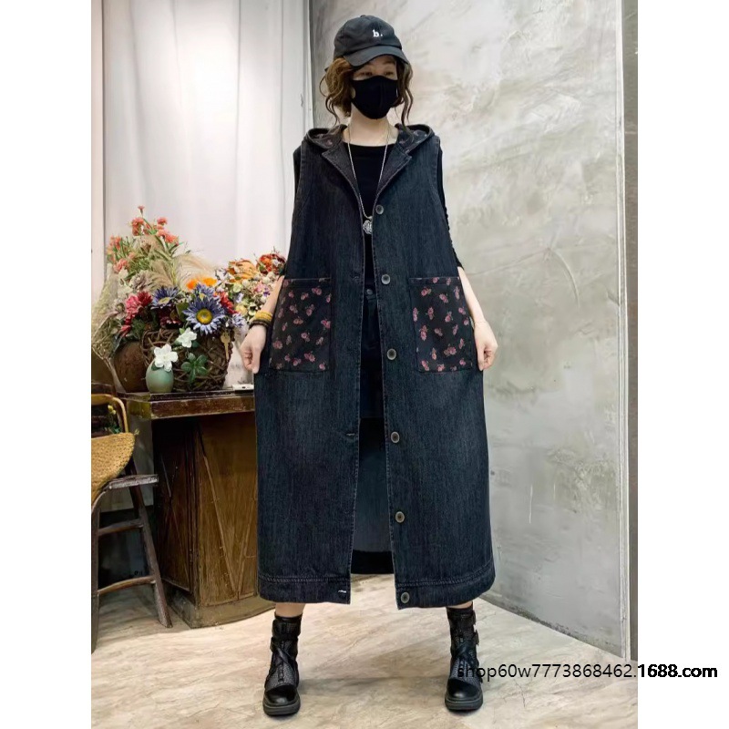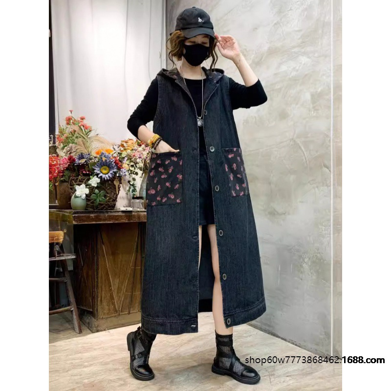 Lengthened Denim Jacket Vest Women 2024 Autumn New Vintage Stitching Floral Peck Loose Hooded Cardigan Women