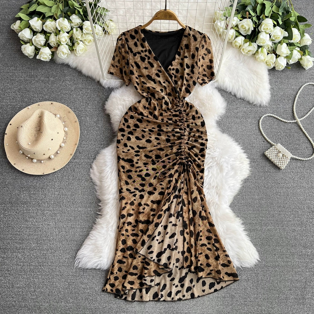 | nameOriginal | Leopard print dress for women summer new fashion sexy slim V-neck long-sleeved slit waist mid-length hip-covering skirt |