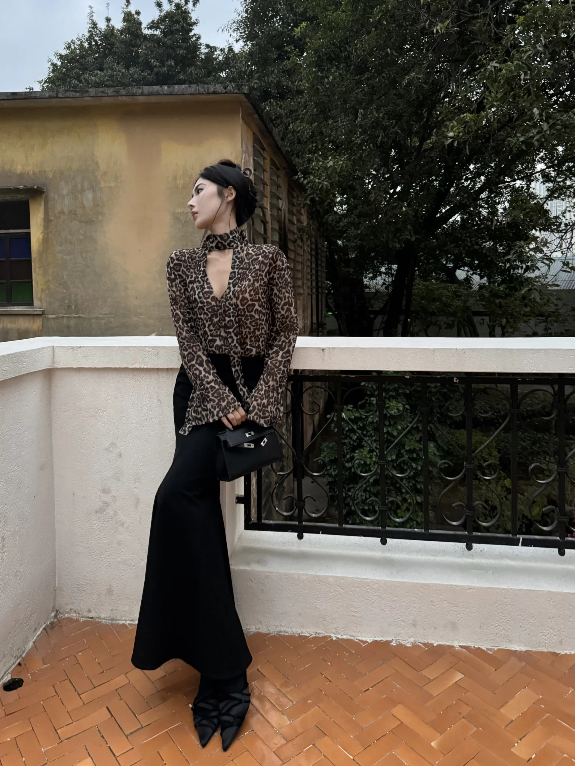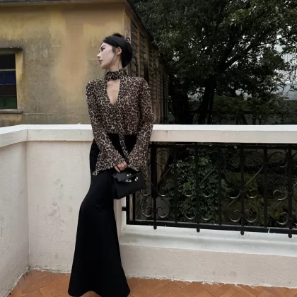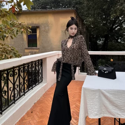 Leopard print long sleeve loose v-neck sun protection chiffon shirt