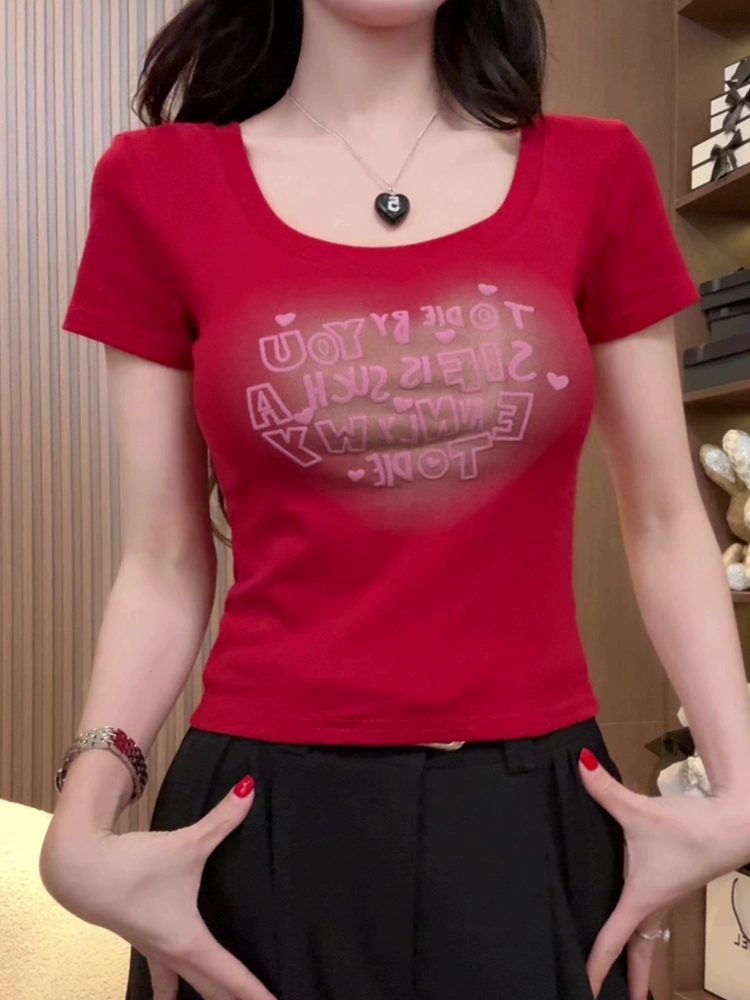 | nameOriginal | Letter printed U-neck right shoulder summer slim short-sleeved T-shirt |