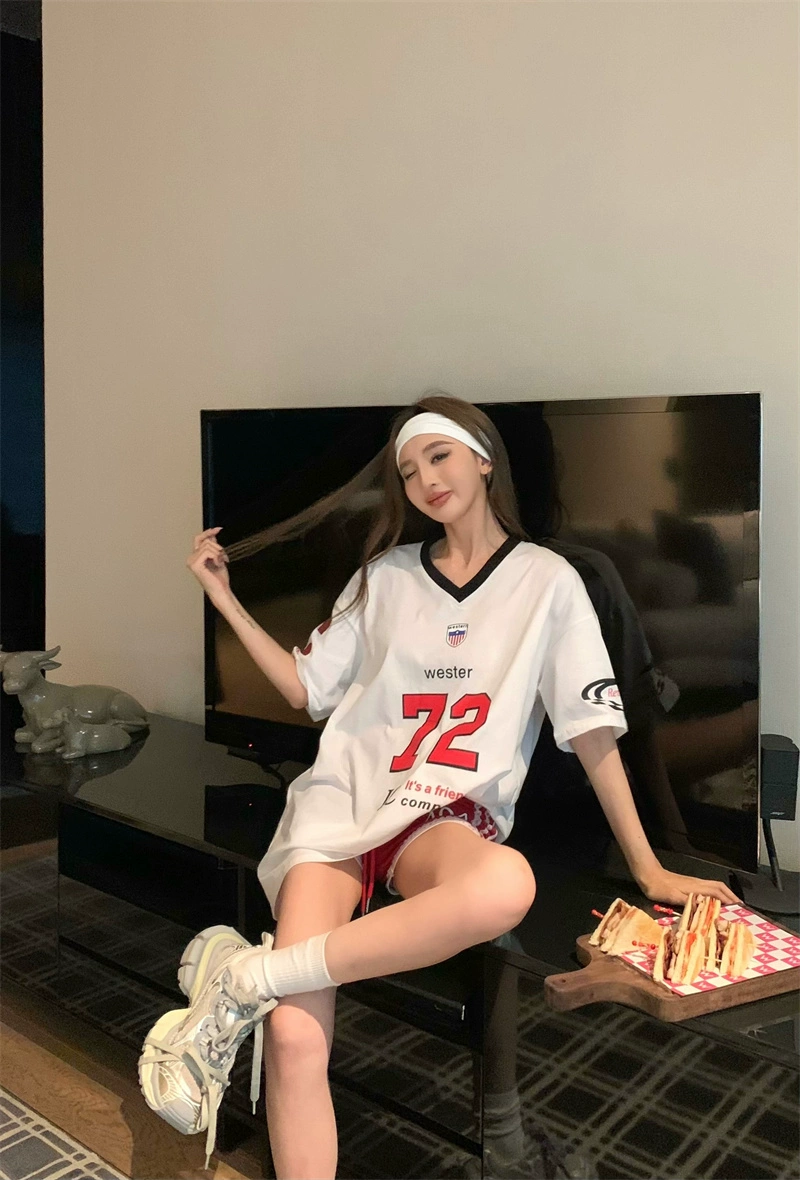 Letter summer retro v-neck loose printed short-sleeved T-shirt
