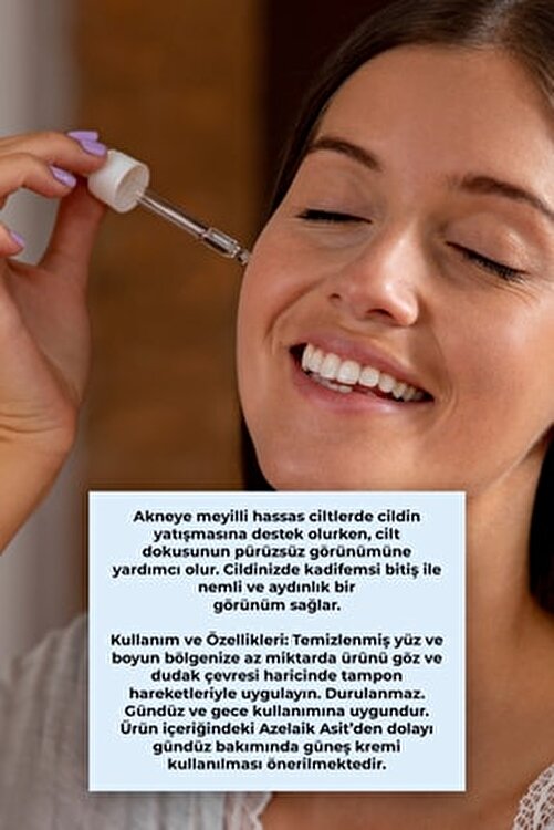 Helps smooth appearance of skin tissue while supporting skin soothing on sensitive skin prone to acne. Provides a moist and bright look with a velvety finish on your skin. Usage and Features: Apply a small amount of product to your cleansed face and neck area with tampon movements except around the eyes and lips. It can not be rinsed. Suitable for day and night use. Due to the Azelaic Acid in the product content, it is recommended to use sunscreen in daycare. INGREDIENTS/INGREDIENTS:Aqua, Niacinamide, Polyglycerin-6, Pentylene Glycol, Azelaic Acid, Phenoxyethanol, Hydroxyethylcellulose, Panthenol, Allantoin, Lactic Acid, Zinc Pca, Glycine, Glycerin, Melaleuca Alternifolia Leaf Extract, Propylene Glycol, Peg-40 Hydrogenated Castor Oil, Ethylhexylglycerin, Tetrasodium Edta, Sodium Hydroxide, Benzoic Acid, Dehydroacetic Acid.